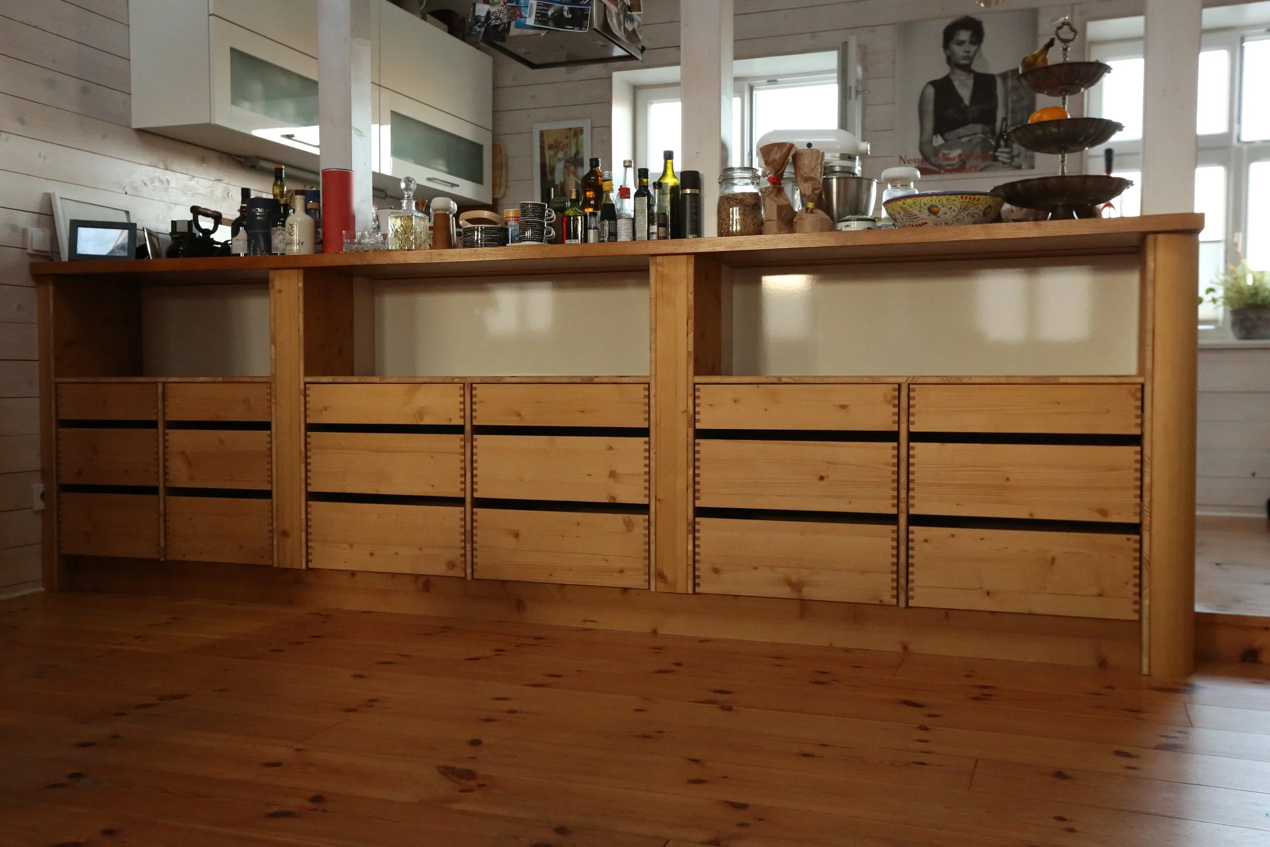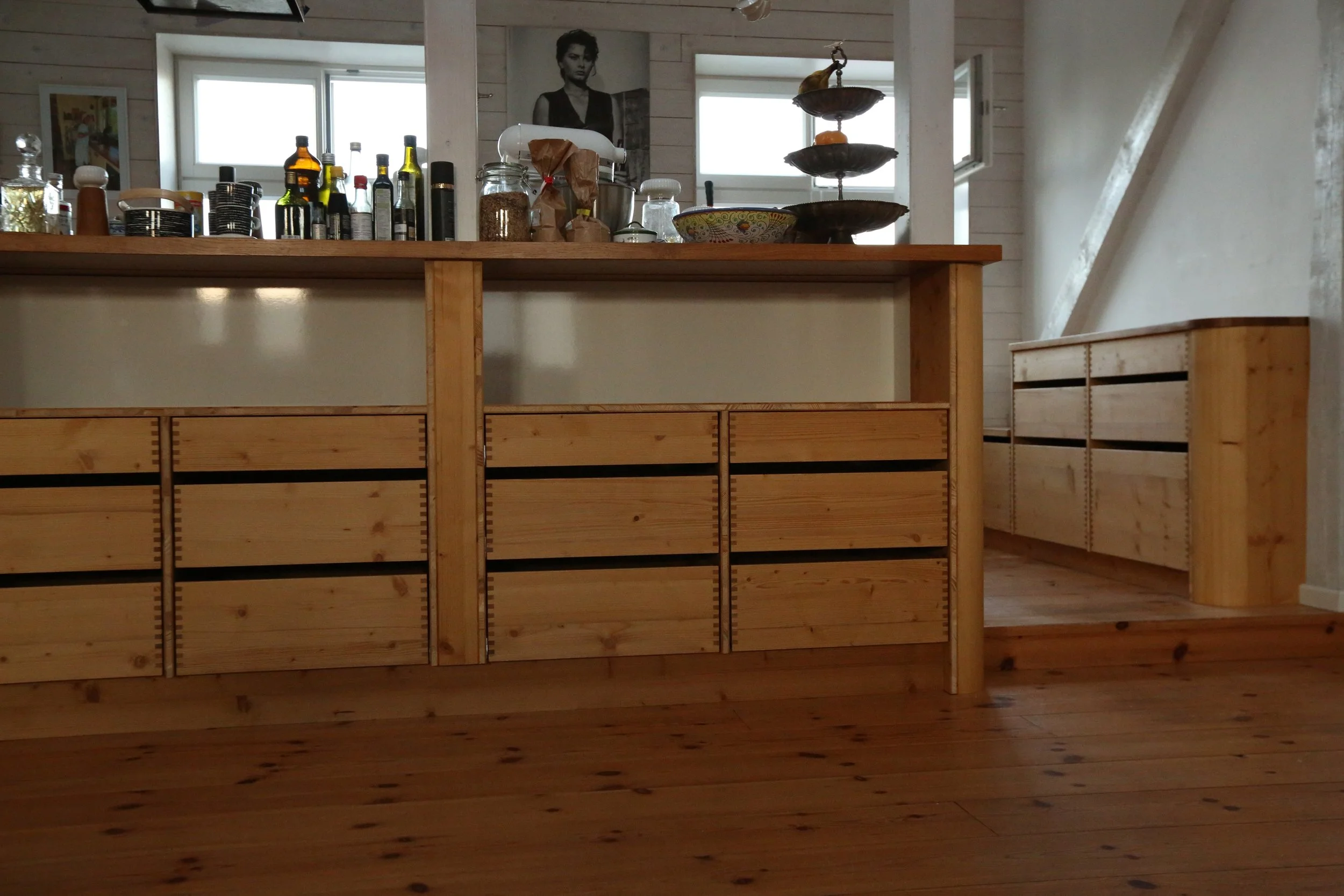 Orientiert haben wir uns an den vorhandenen Holzarten sowie am Bau- und Einrichtungsstil des Hauses. Die obere Platte des Sideboards und die große Küchenarbeitsplatte bestehen aus geölter Massivholzeiche. Die Schubladen sind aus massivem Fichtenholz und die Korpusse sind aus Fichte-Dreischichtplatten gefertigt. Die gesamte Oberfläche ist geölt.
