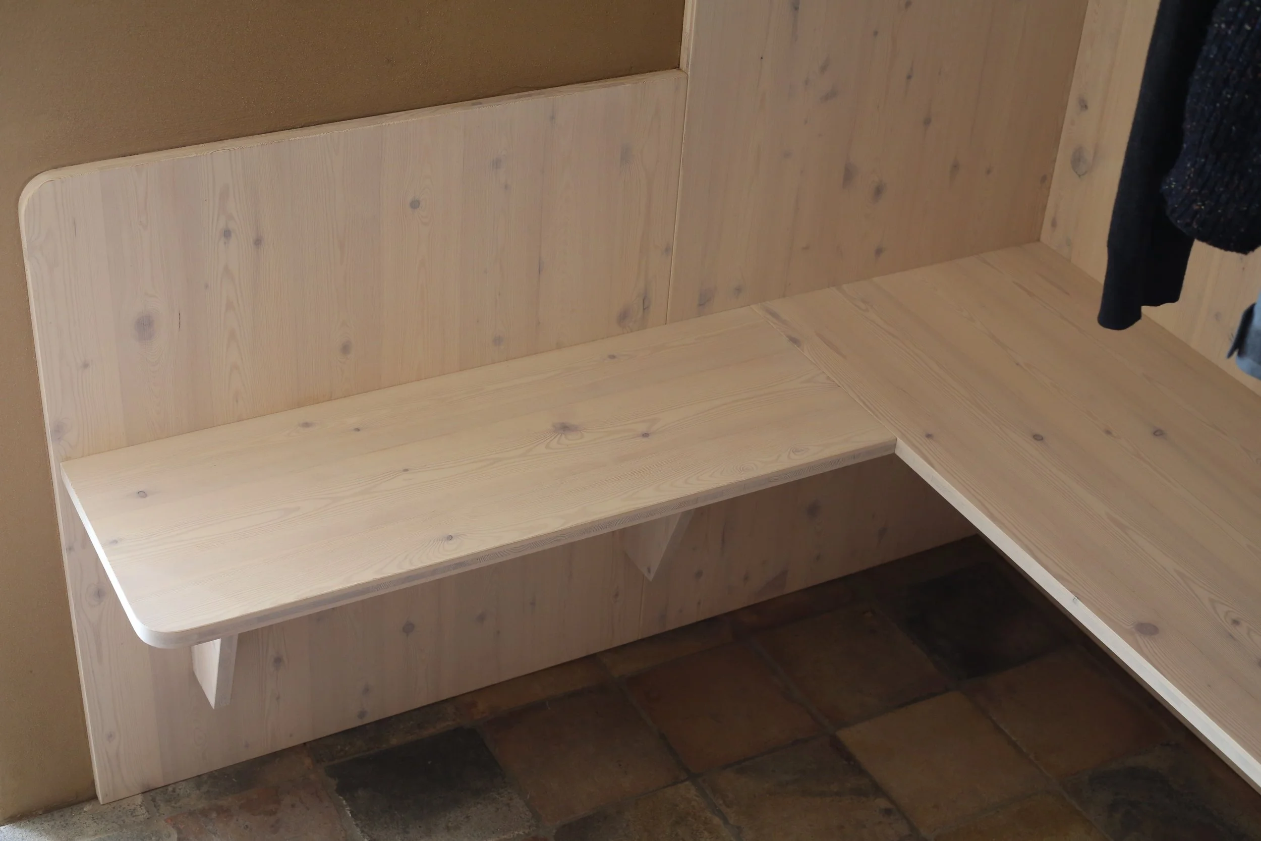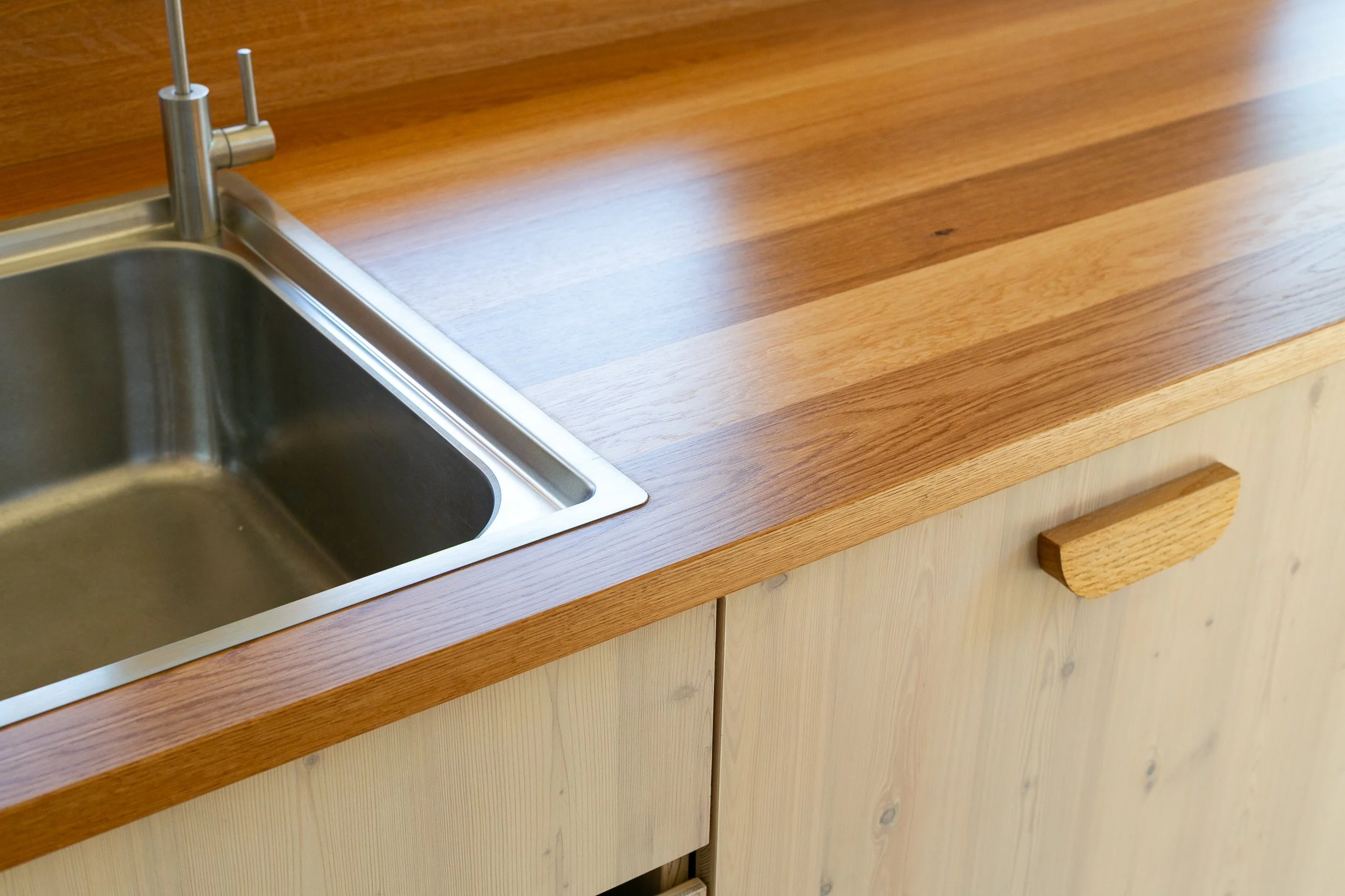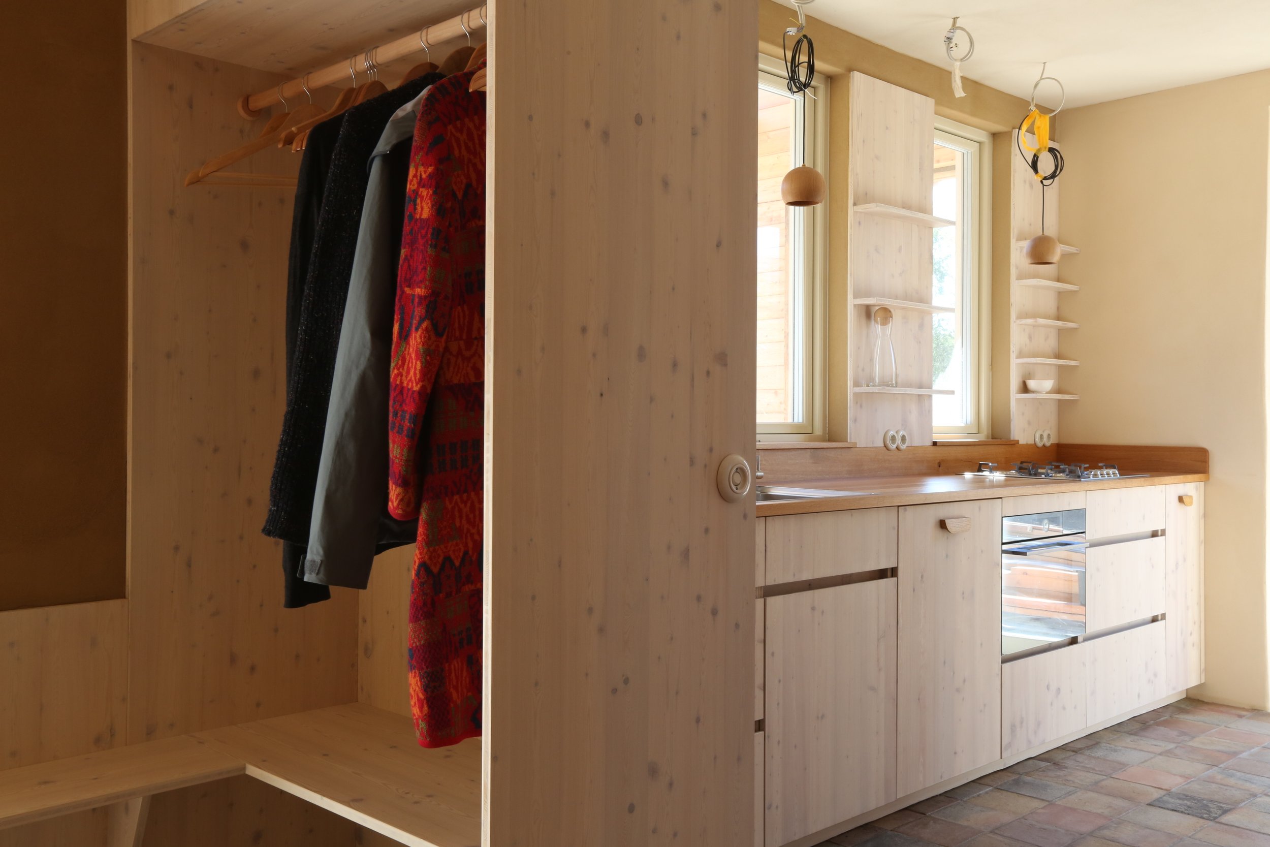 Küche und Garderobe bestehen aus Lärchenholz. Die Arbeitsplatte ist aus Eiche. Während der Planungsphase war eine Arbeitsplatte aus Edelstahl angedacht, die Küchenfronten sollten naturgeölt belassen sein. Das hätte eine große Naturholzoberfläche und eine eher kühle Haptik der Edelstahloberfläche bedeutet. Die Entscheidung fiel auf eine weiß geölte Oberfläche aus Lärchen-Dreischichtplatte, kombiniert mit den naturbelassenen Vollholzschubladen und der geölten Arbeitsplatte aus Eiche.
