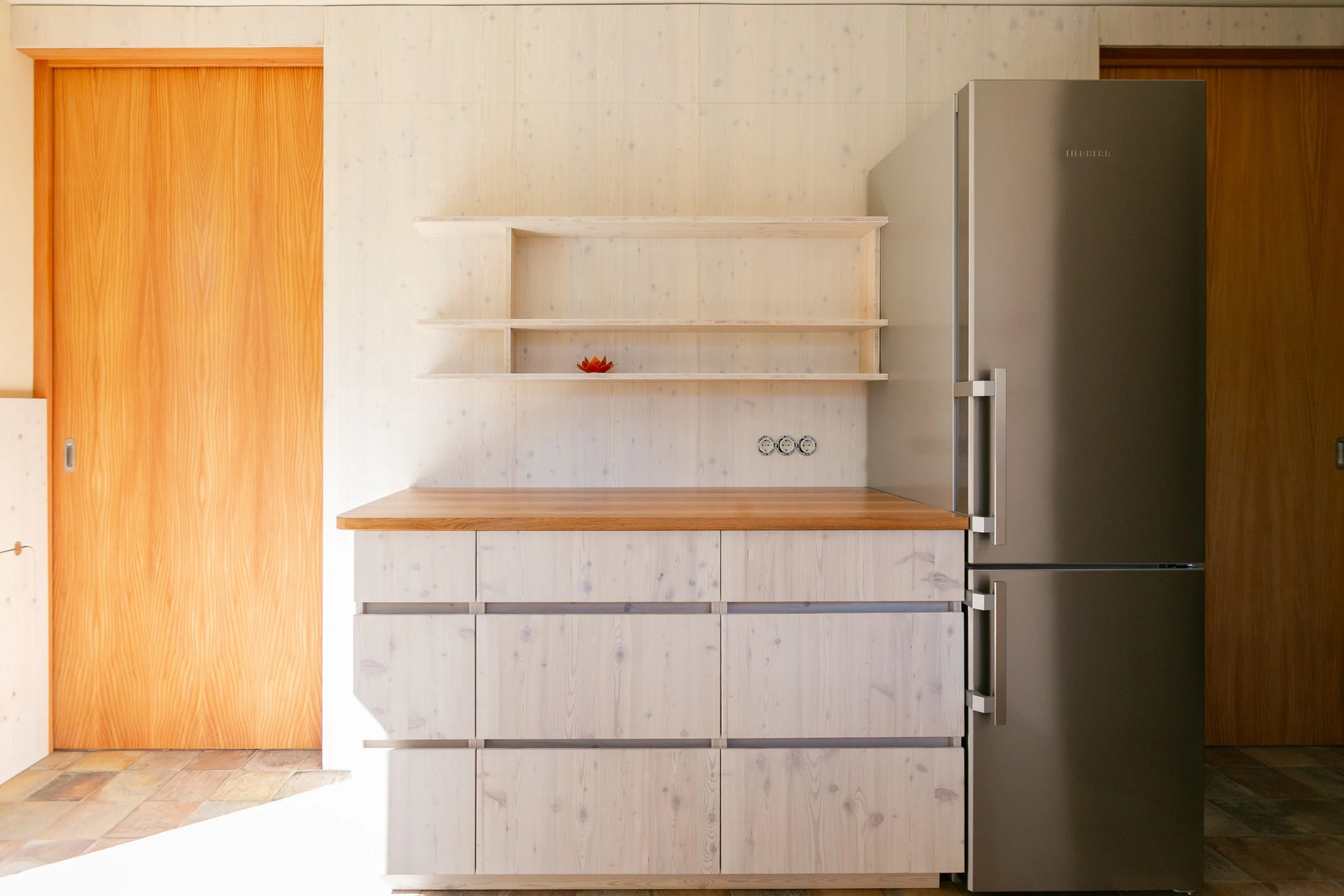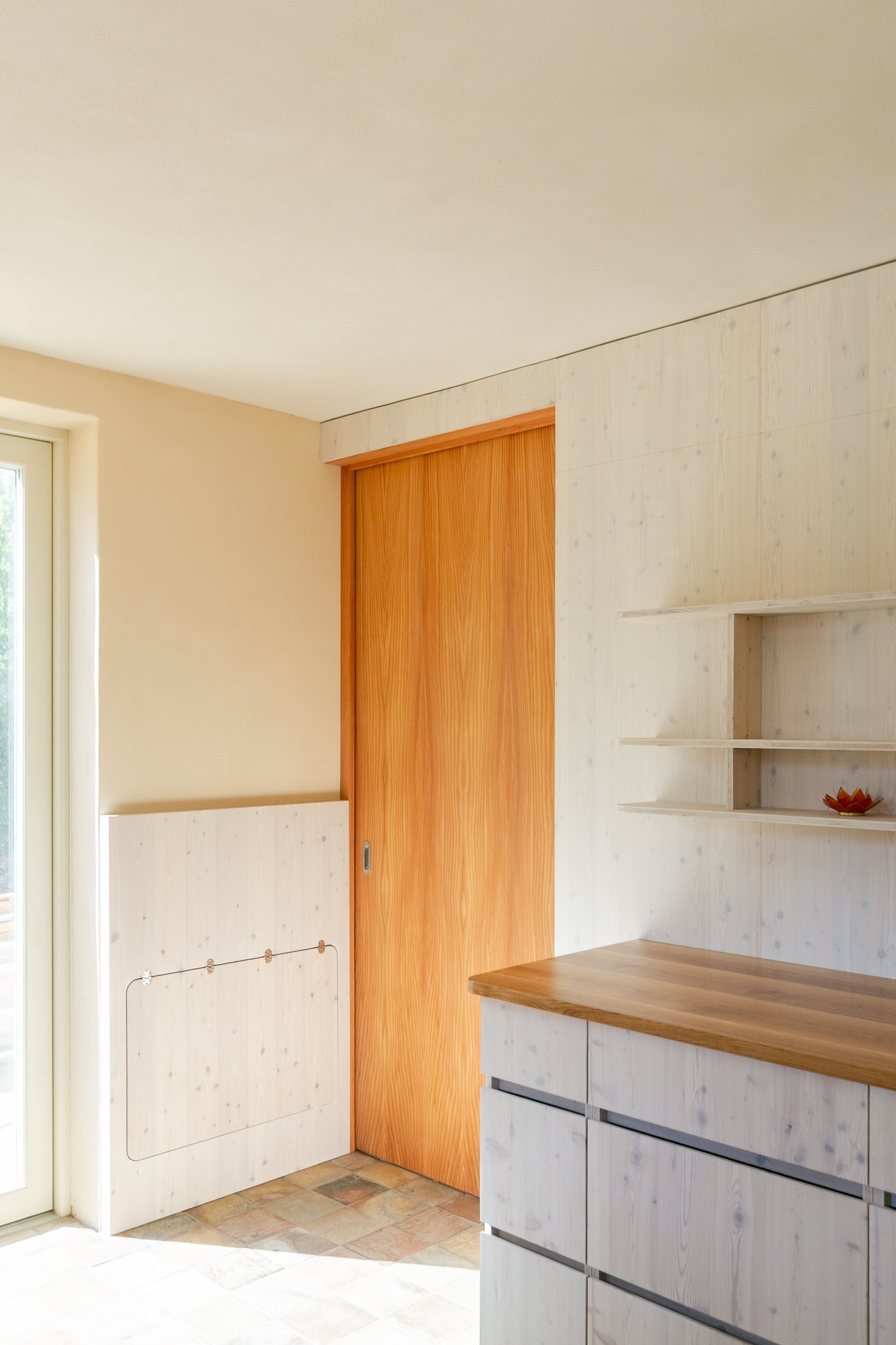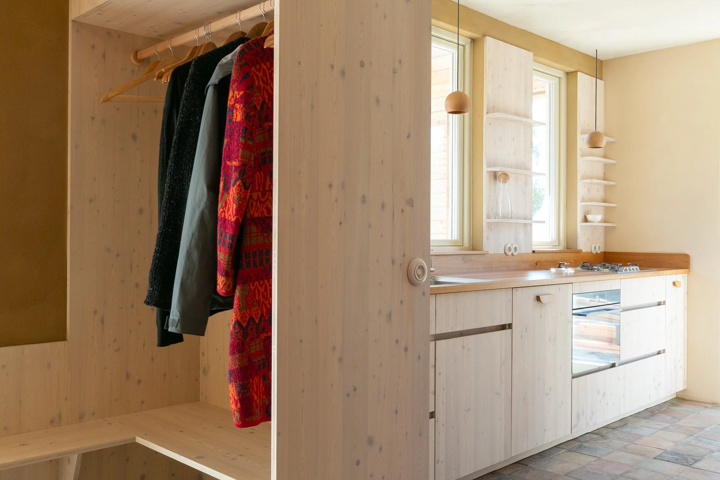 Küche und Garderobe bestehen aus Lärchenholz. Die Arbeitsplatte ist aus Eiche. Während der Planungsphase war eine Arbeitsplatte aus Edelstahl angedacht, die Küchenfronten sollten naturgeölt belassen sein. Das hätte eine große Naturholzoberfläche und eine eher kühle Haptik der Edelstahloberfläche bedeutet. Die Entscheidung fiel auf eine weiß geölte Oberfläche aus Lärchen-Dreischichtplatte, kombiniert mit den naturbelassenen Vollholzschubladen und der geölten Arbeitsplatte aus Eiche.