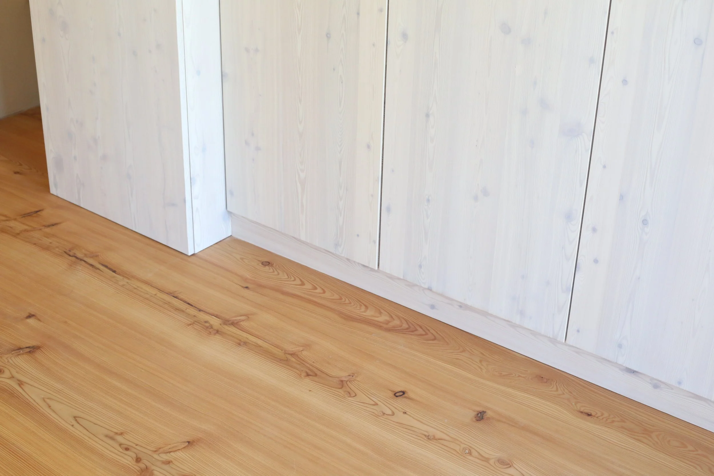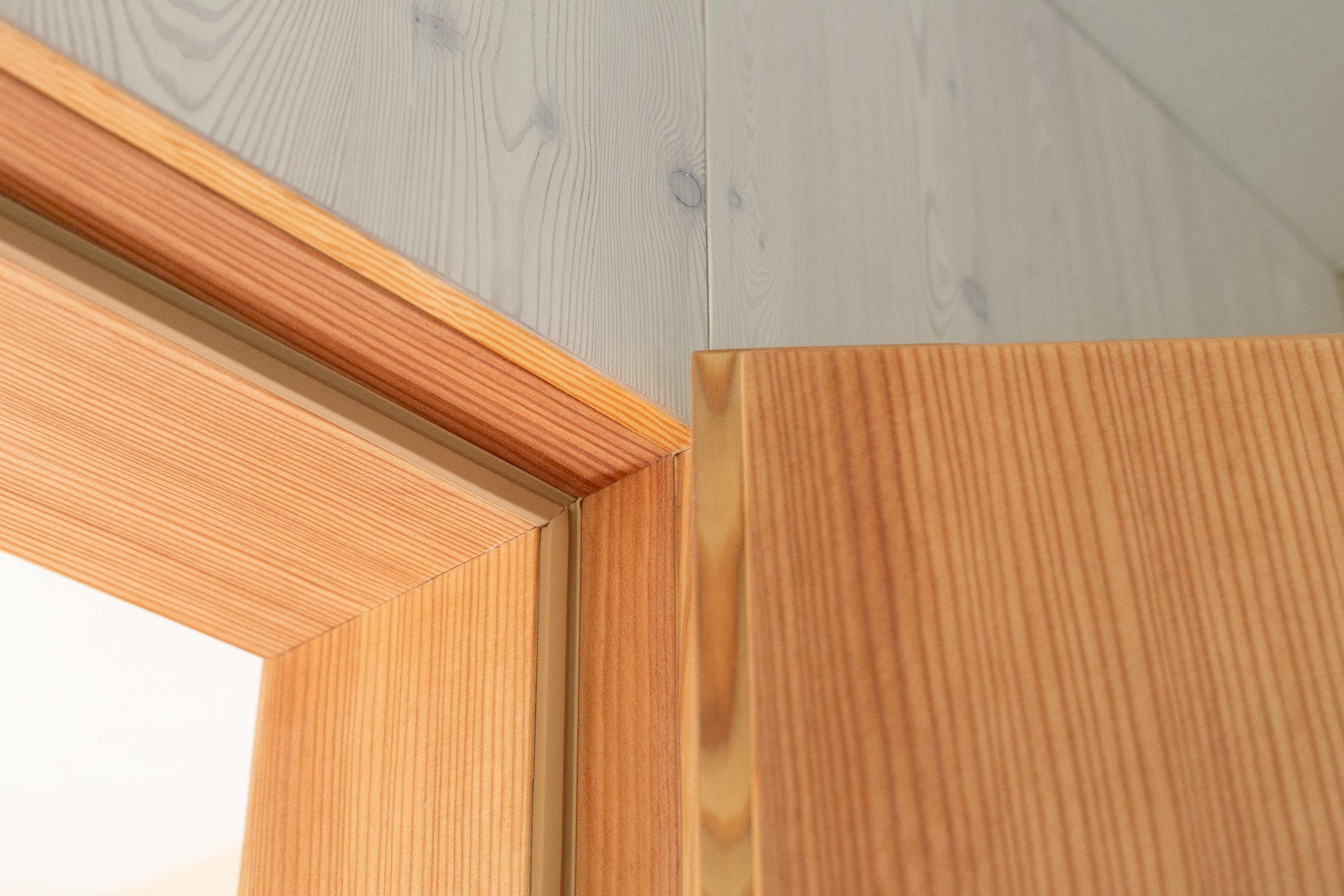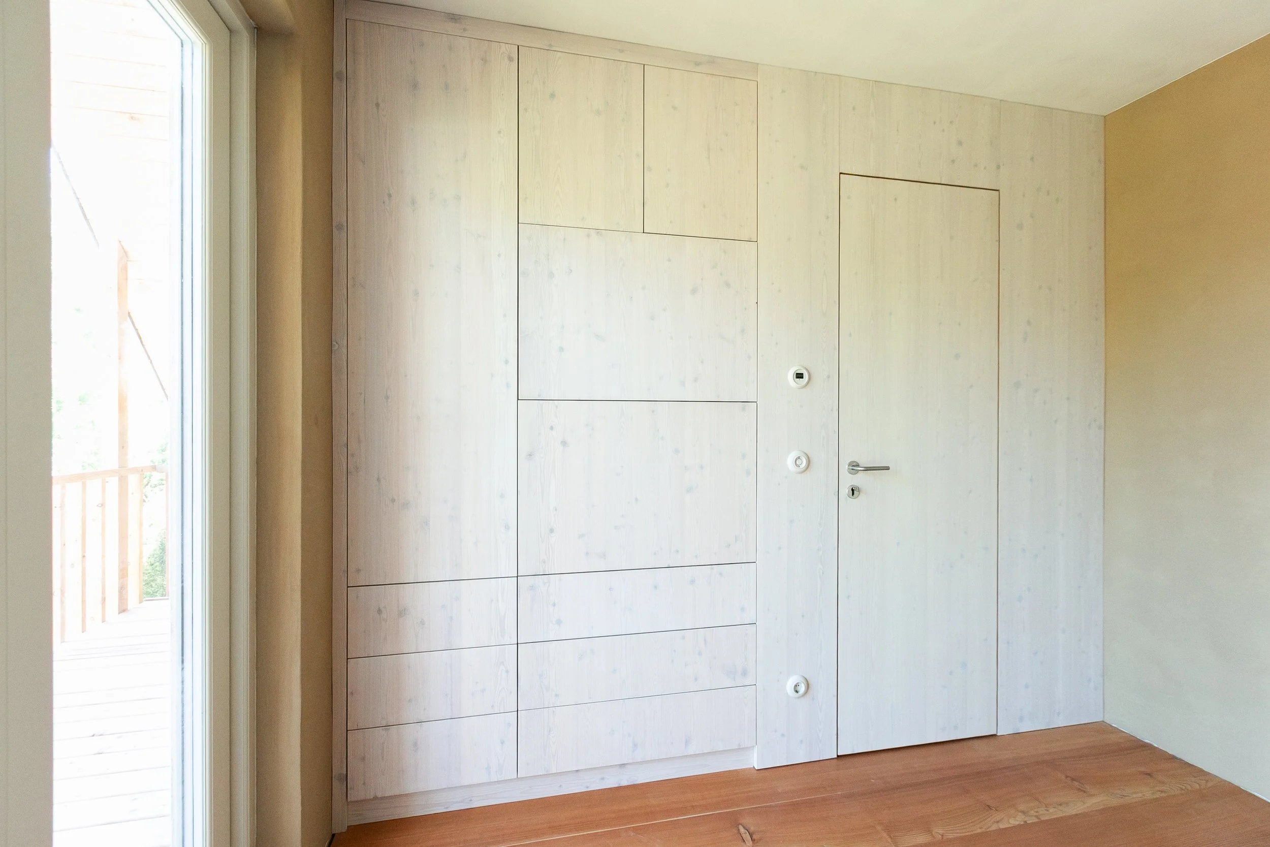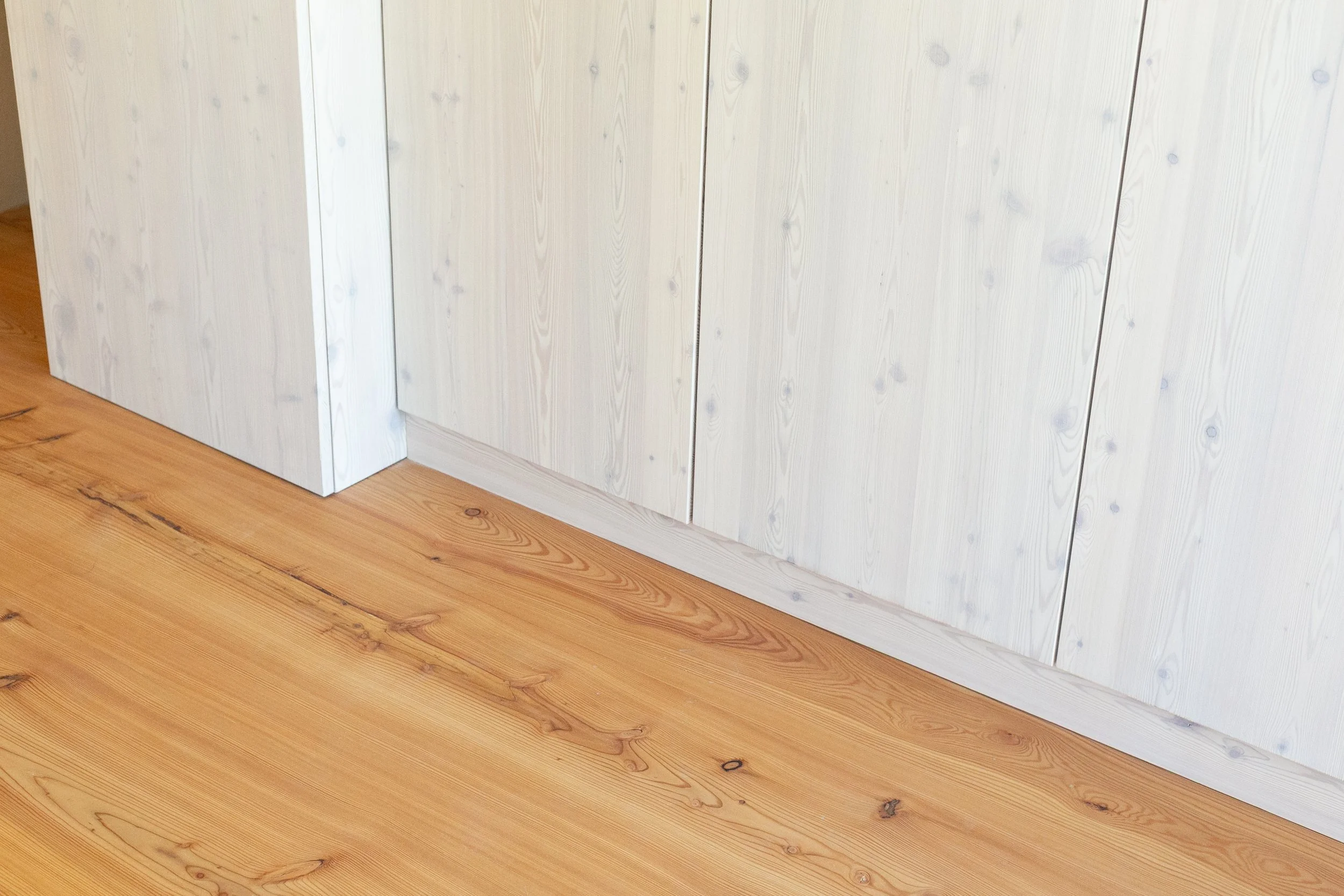 Für die Türen haben wir das Lärchenholz beibehalten und sie mit einem Starkfurnier versehen. Da natürliche Materialien verwendet werden sollten, besteht das Türblatt aus einer Dreischichtplatte, anstatt wie üblich aus Wabenkern oder Röhrenspan.