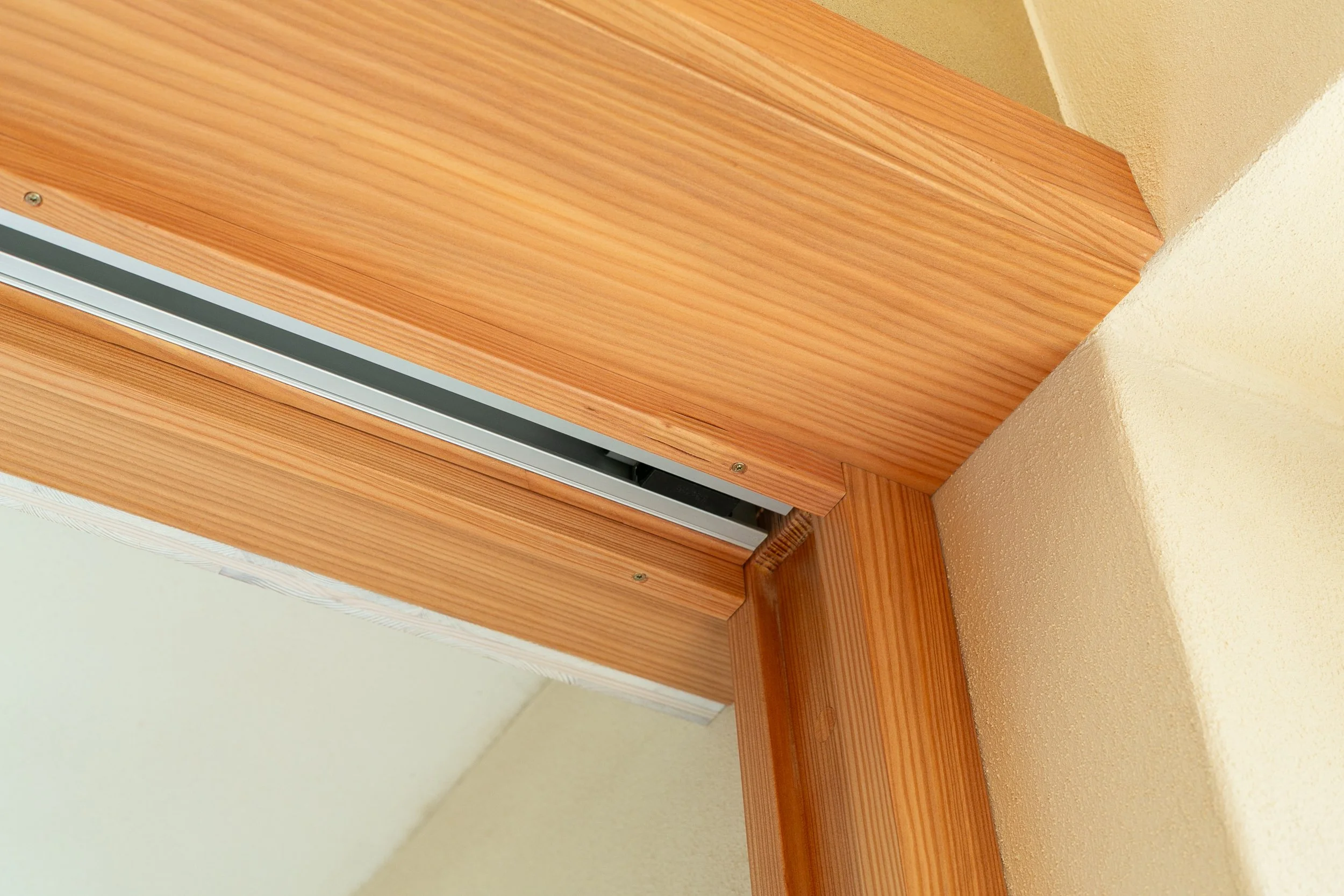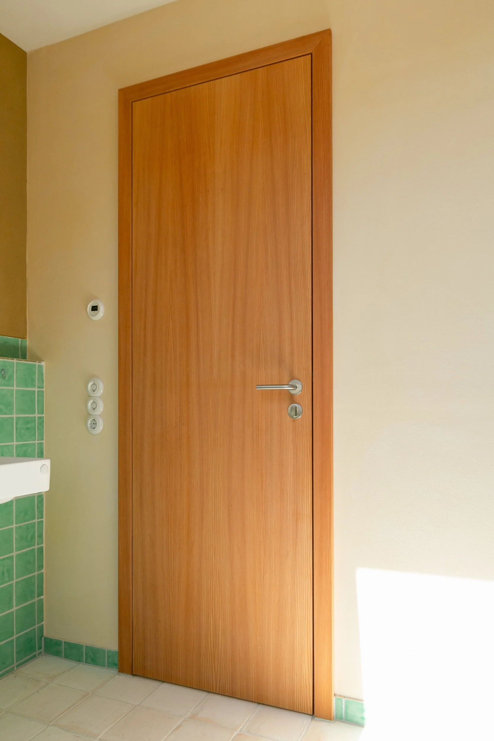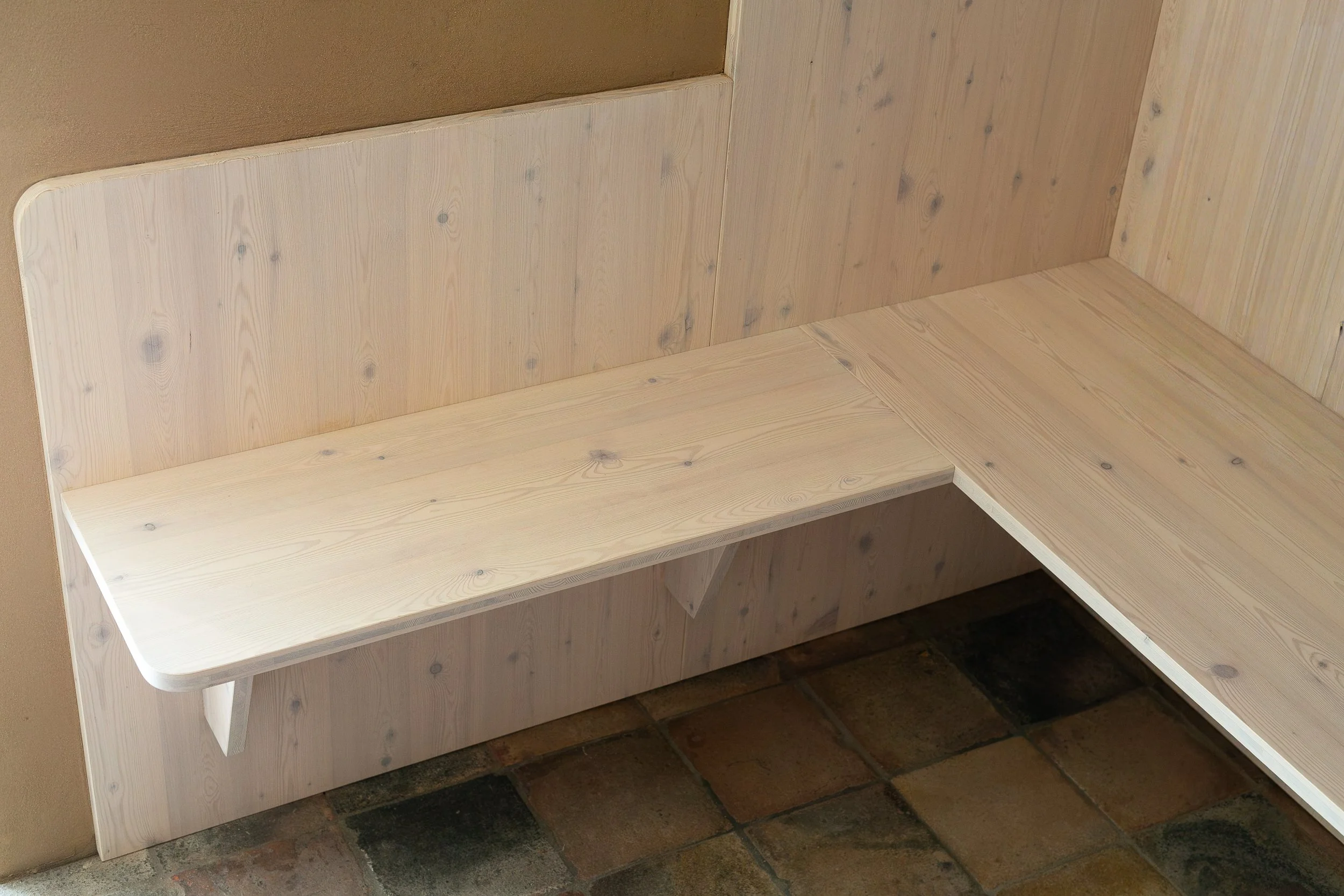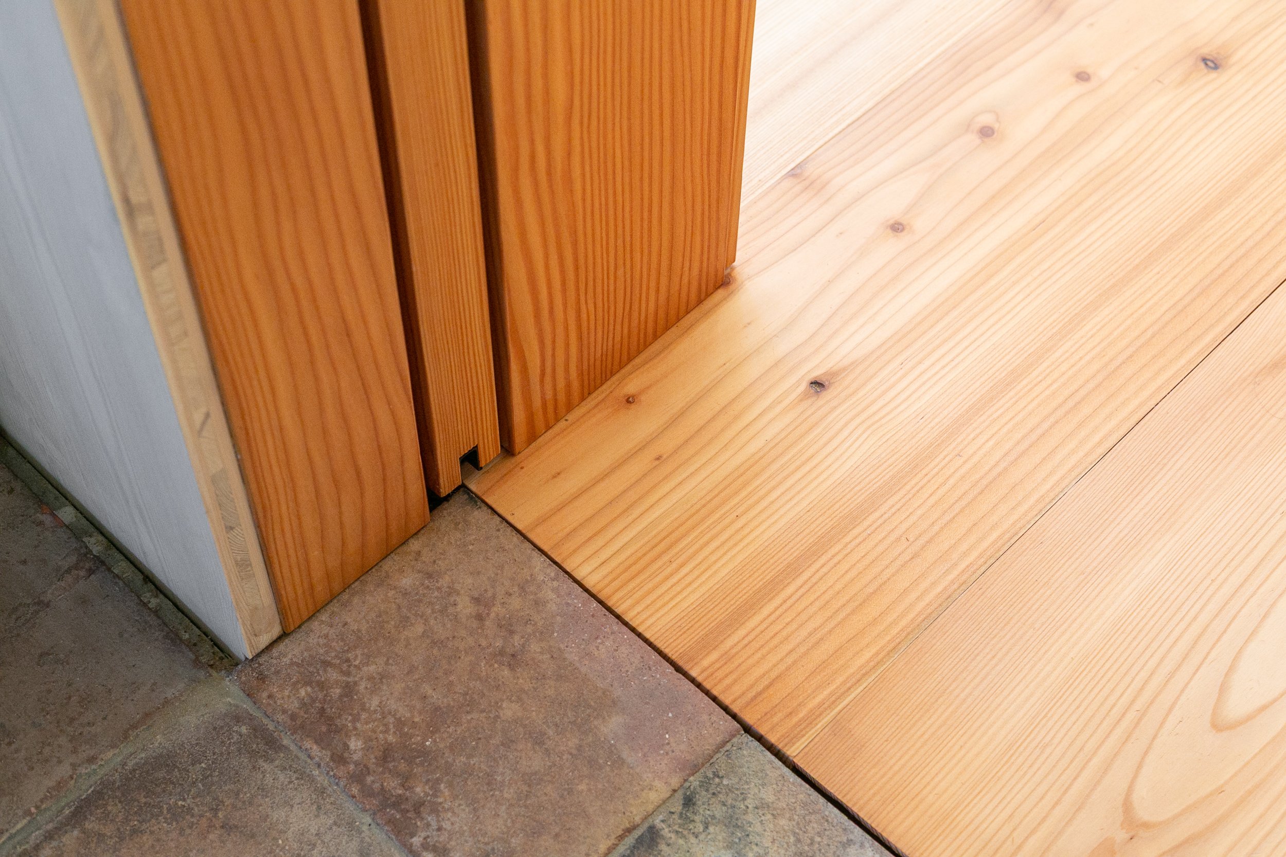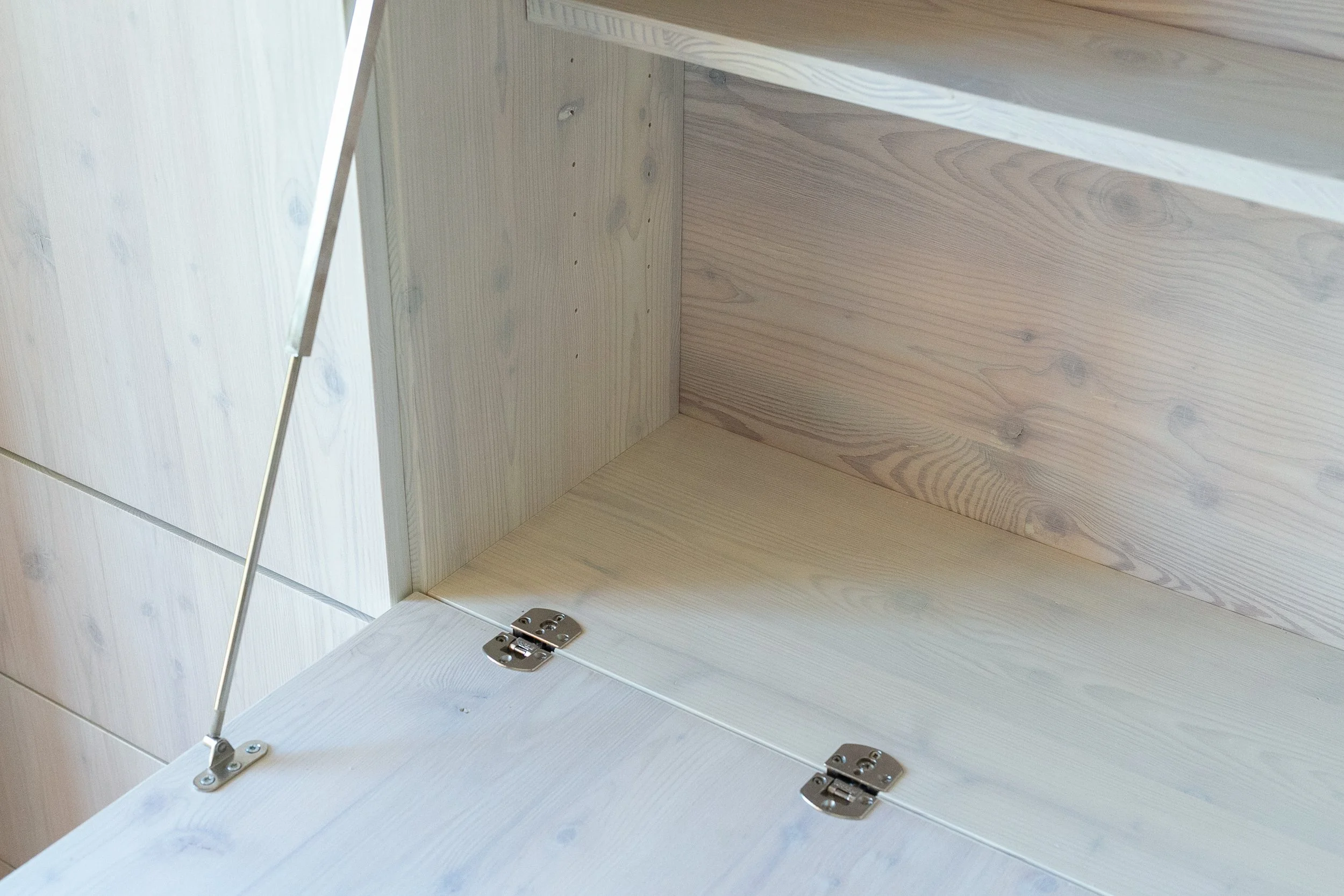 Für die Türen haben wir das Lärchenholz beibehalten und sie mit einem Starkfurnier versehen. Da natürliche Materialien verwendet werden sollten, besteht das Türblatt aus einer Dreischichtplatte, anstatt wie üblich aus Wabenkern oder Röhrenspan.