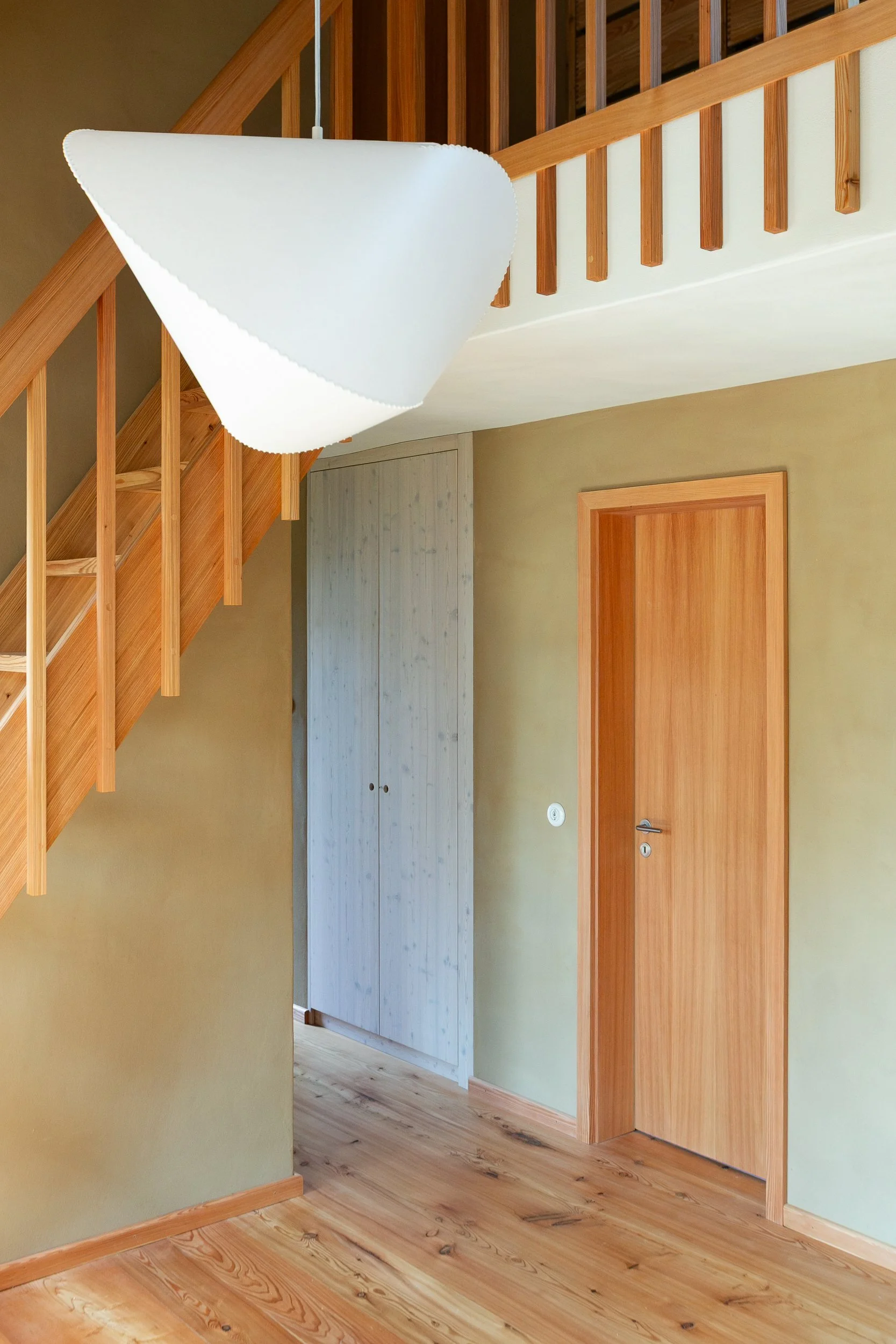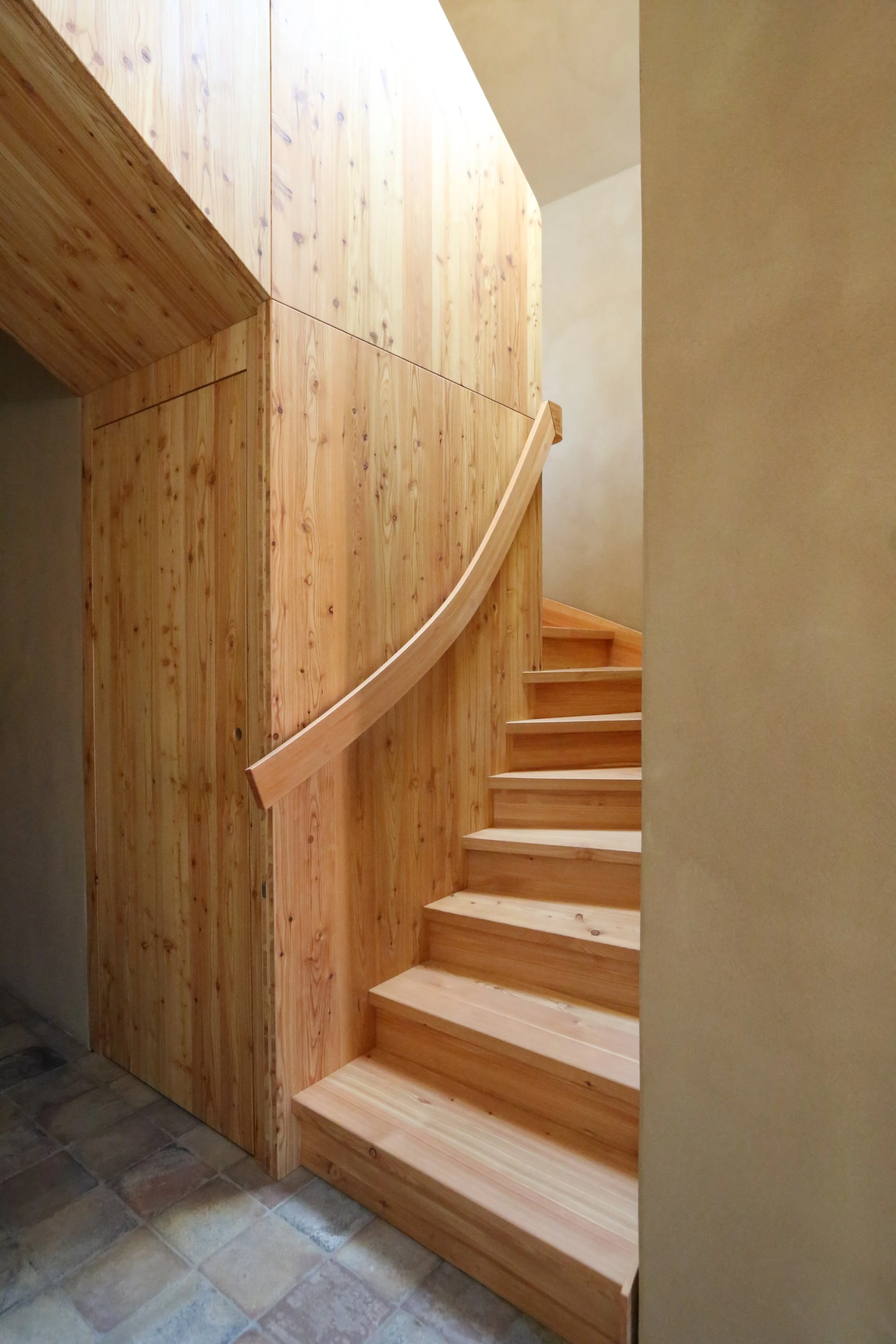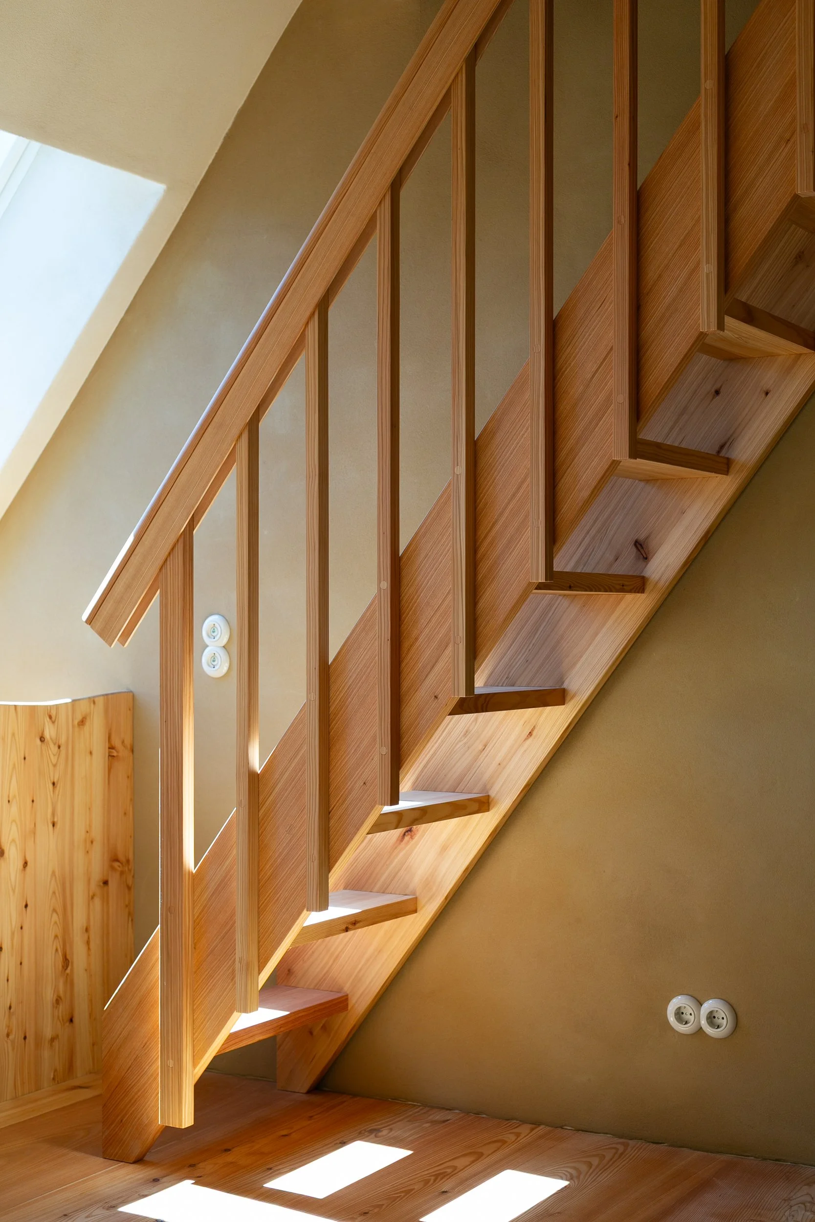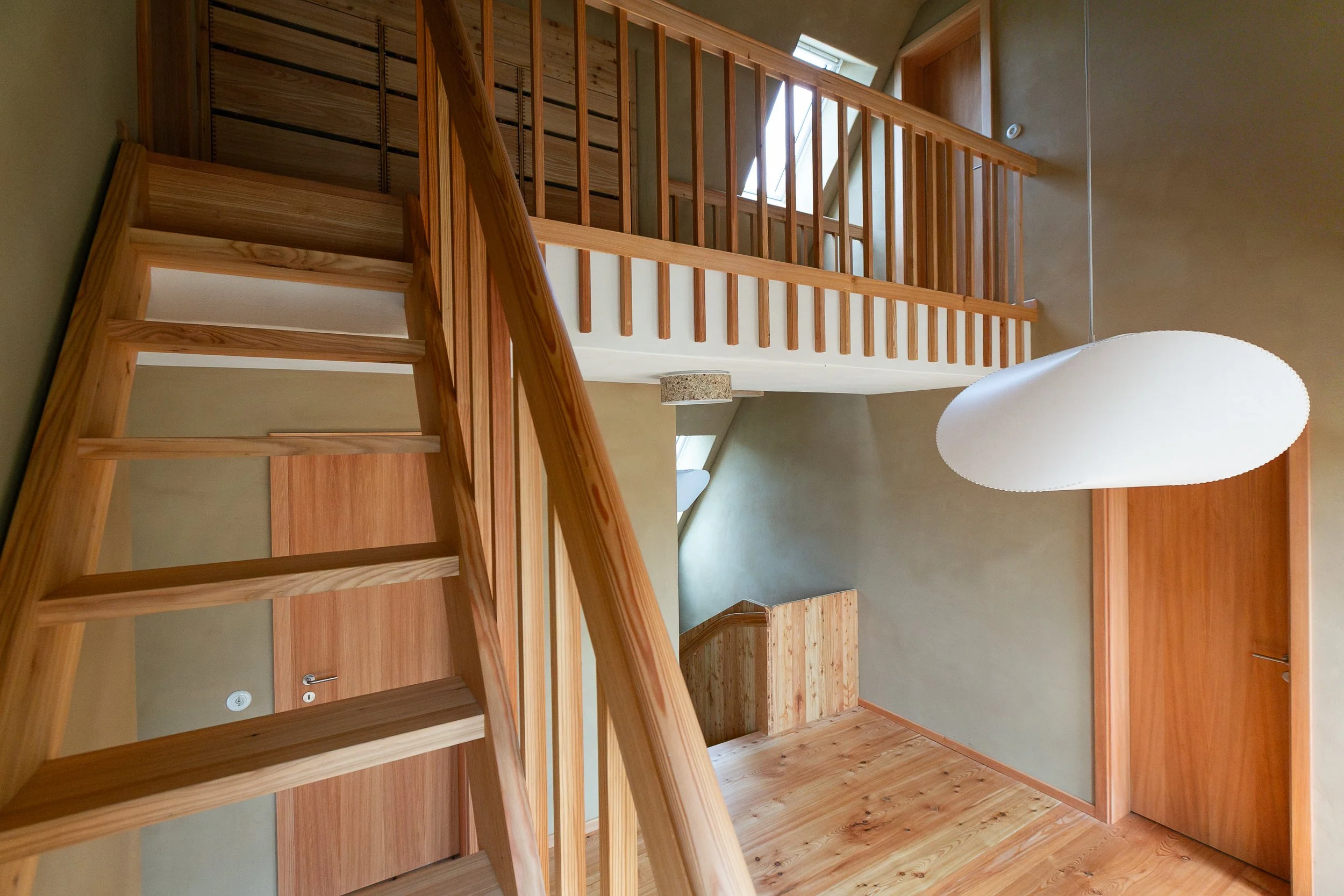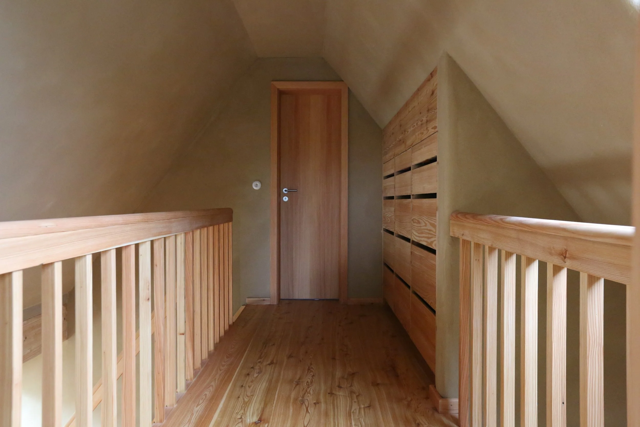 Die schlanken, überstehenden Treppenwangen wurden aus zwei Gründen angebracht:Zum Schutz der Lehmputzwand bei Alltagsnutzung.