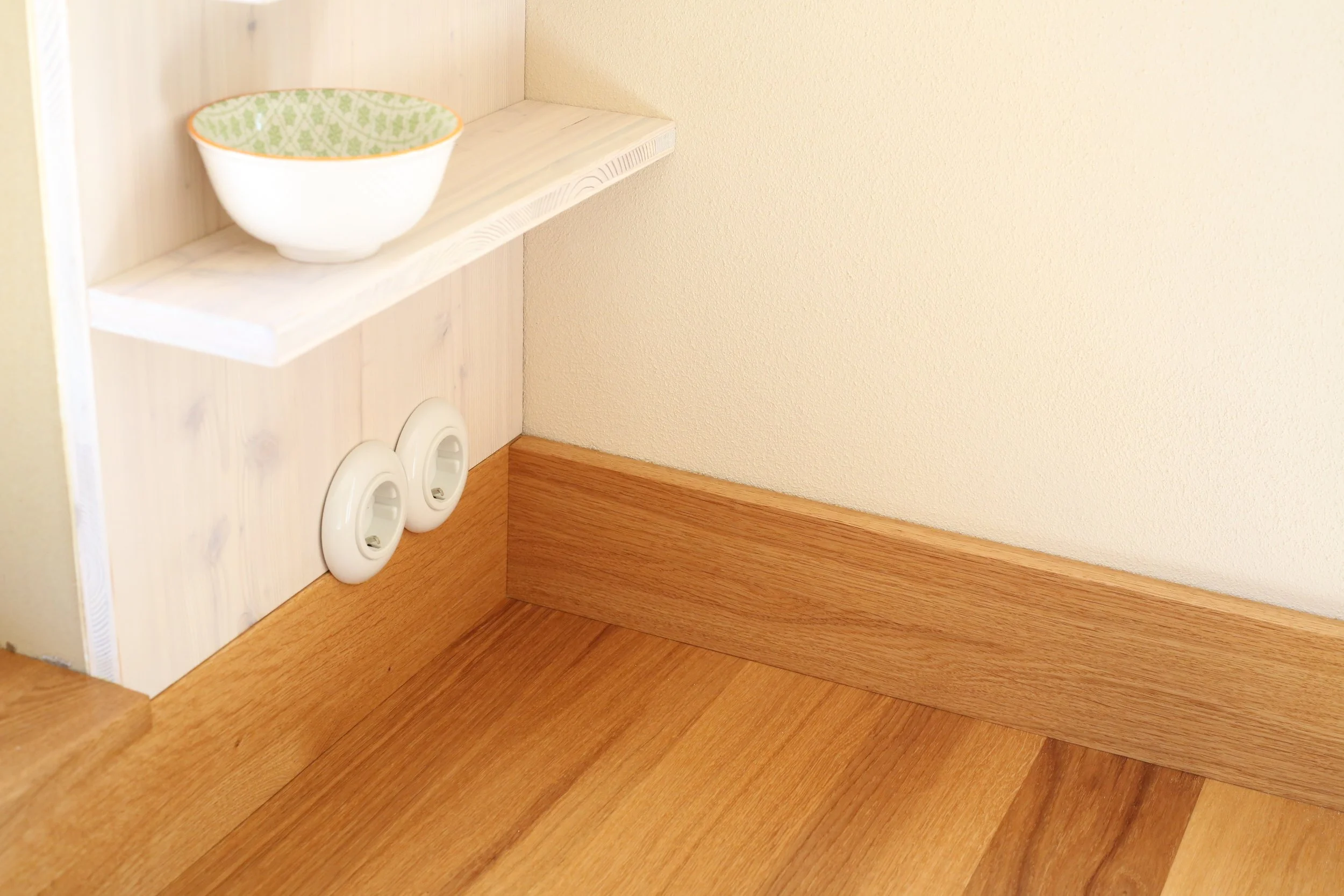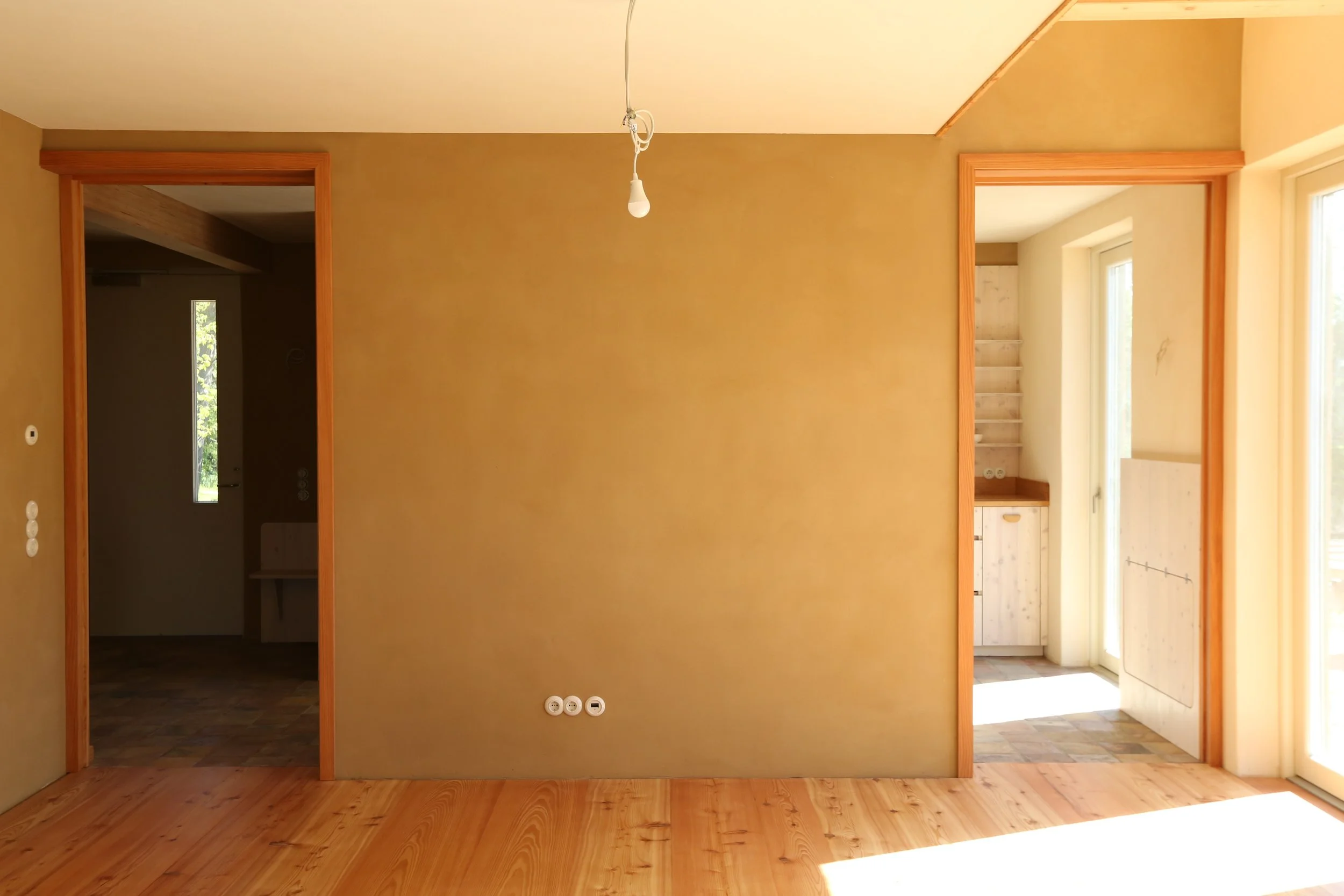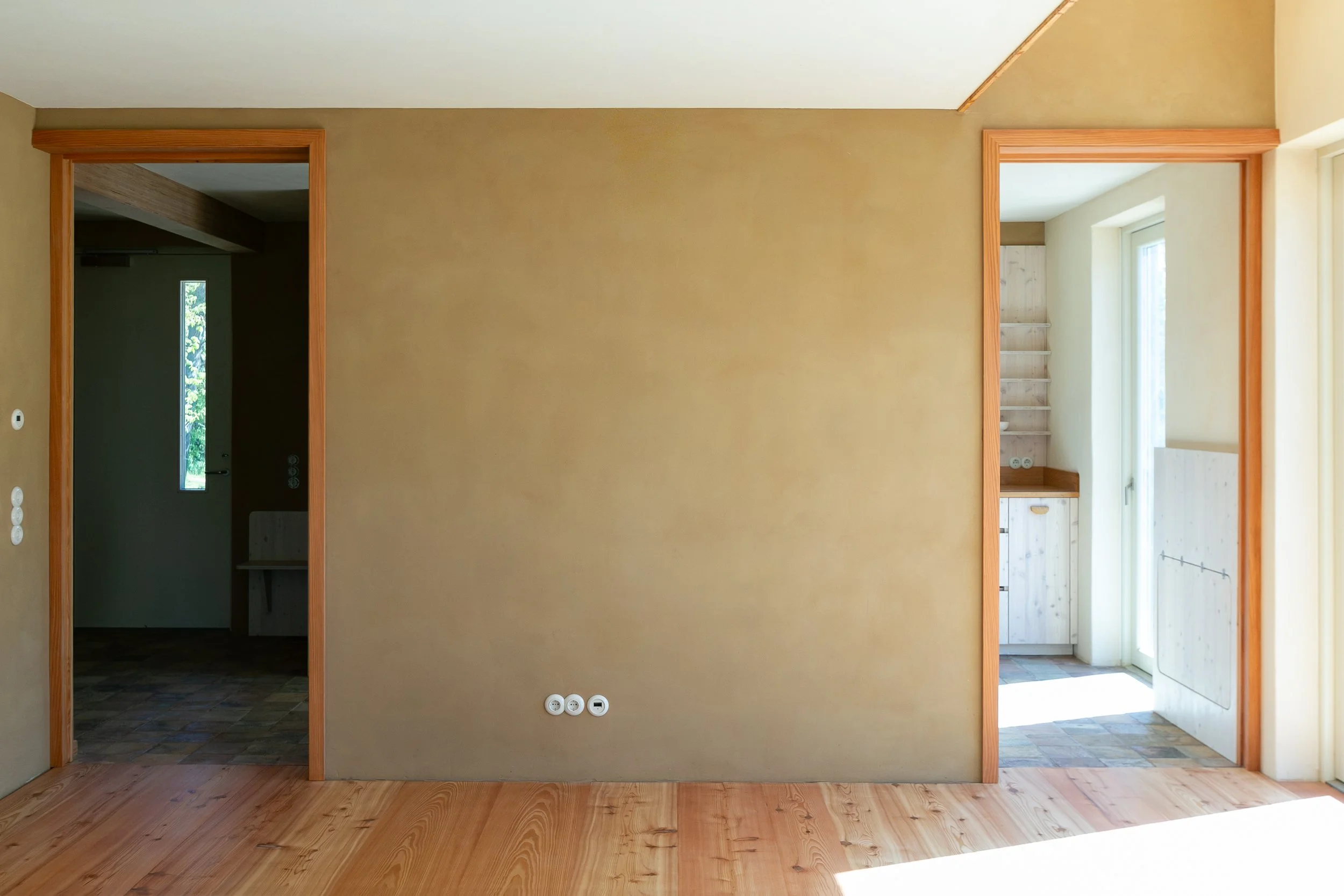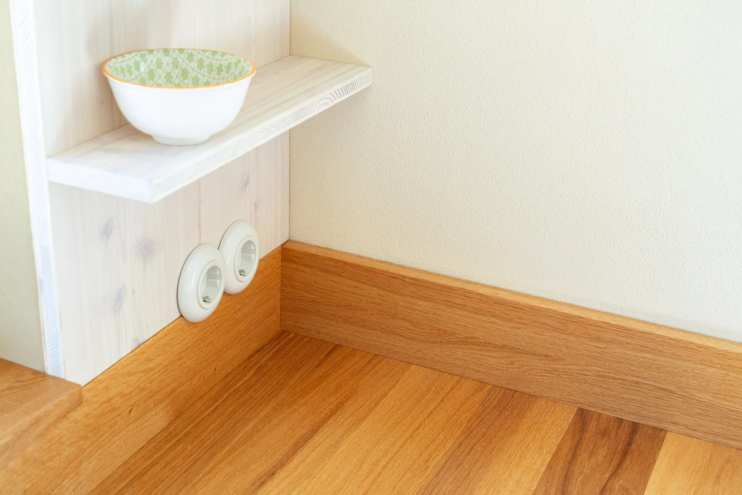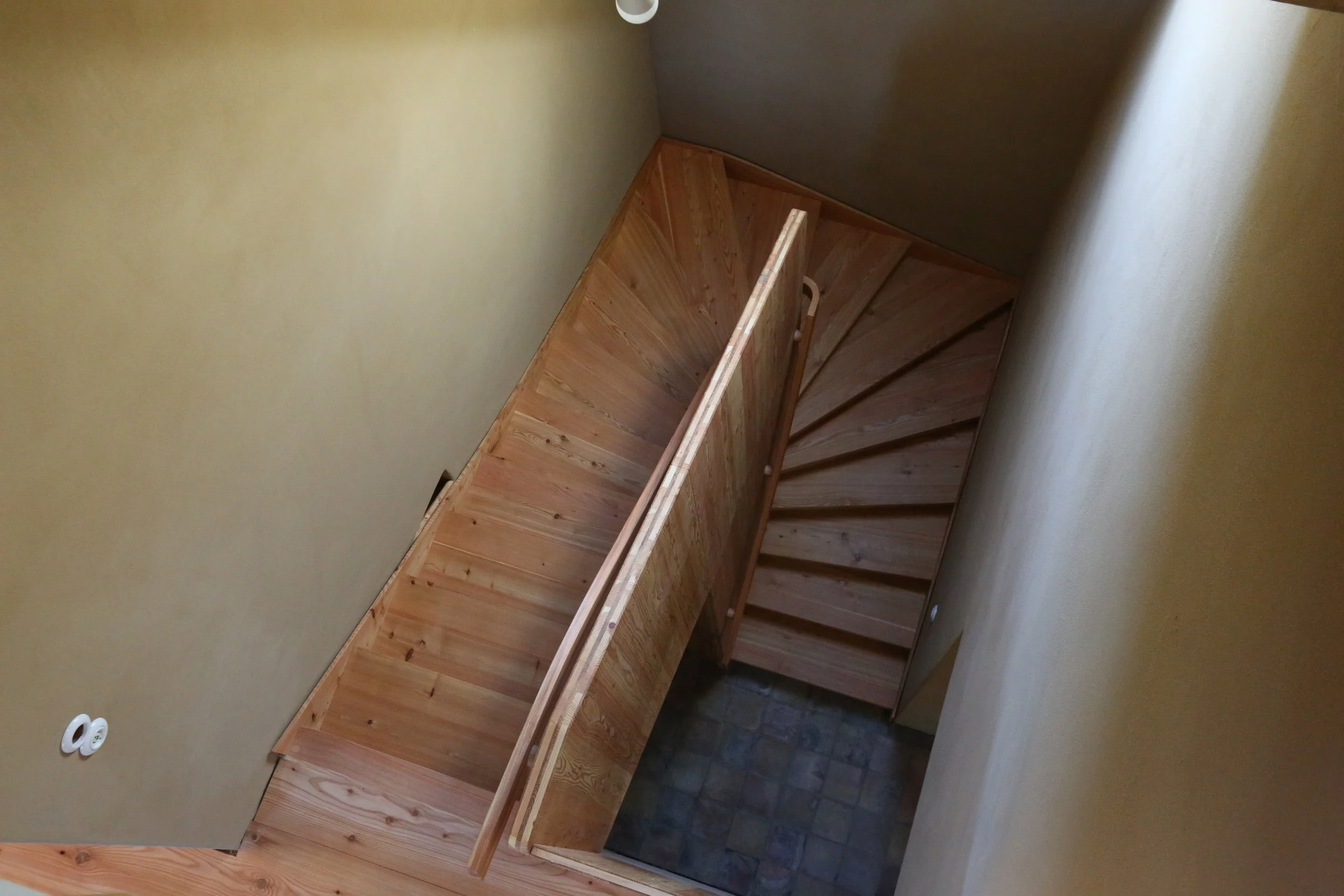 Die schlanken, überstehenden Treppenwangen wurden aus zwei Gründen angebracht:Zum Schutz der Lehmputzwand bei Alltagsnutzung.
