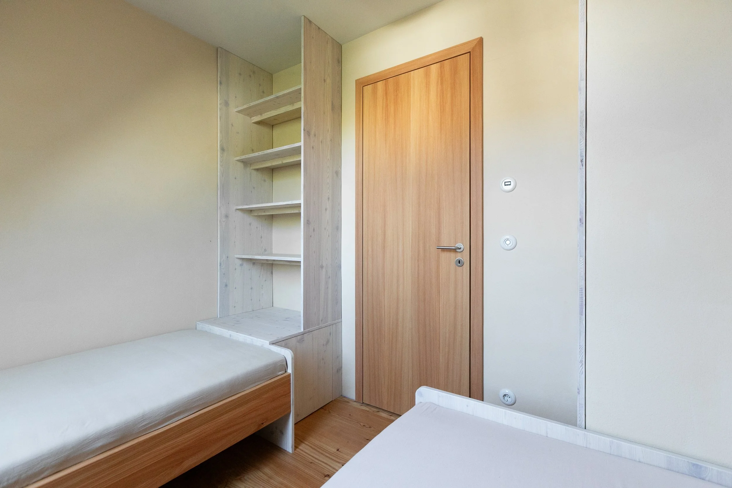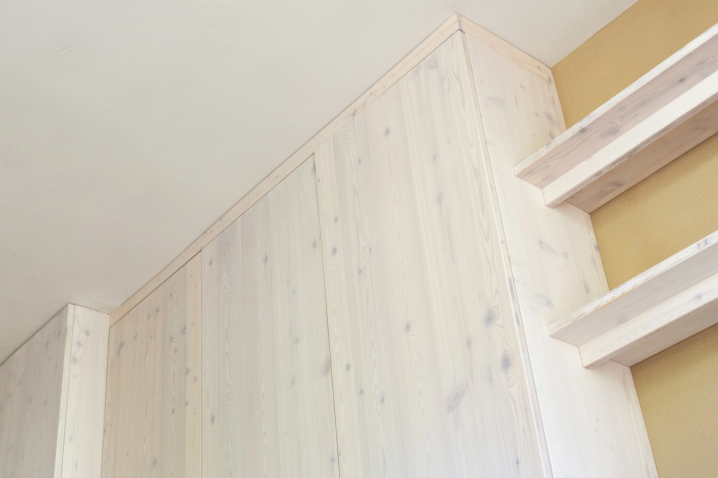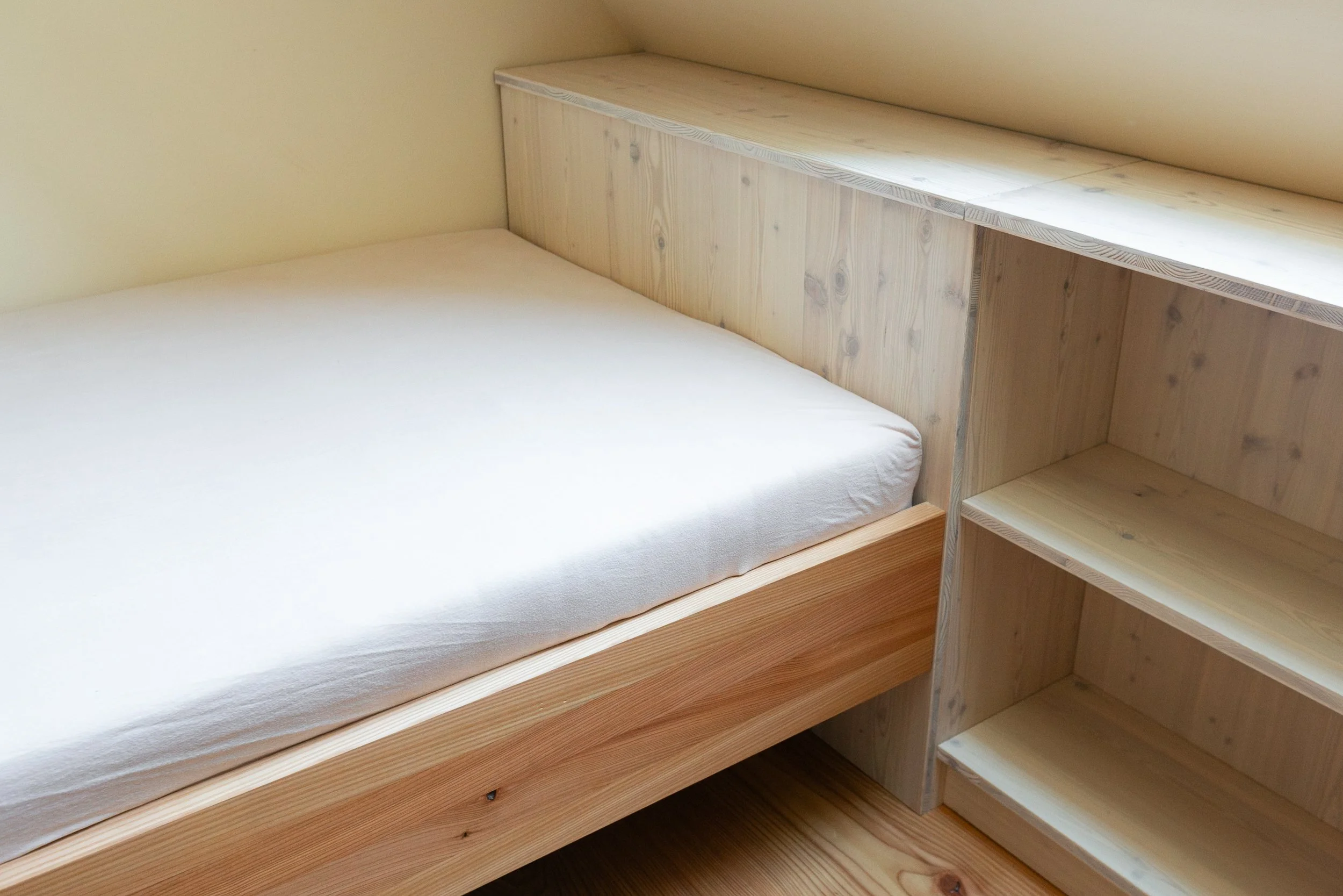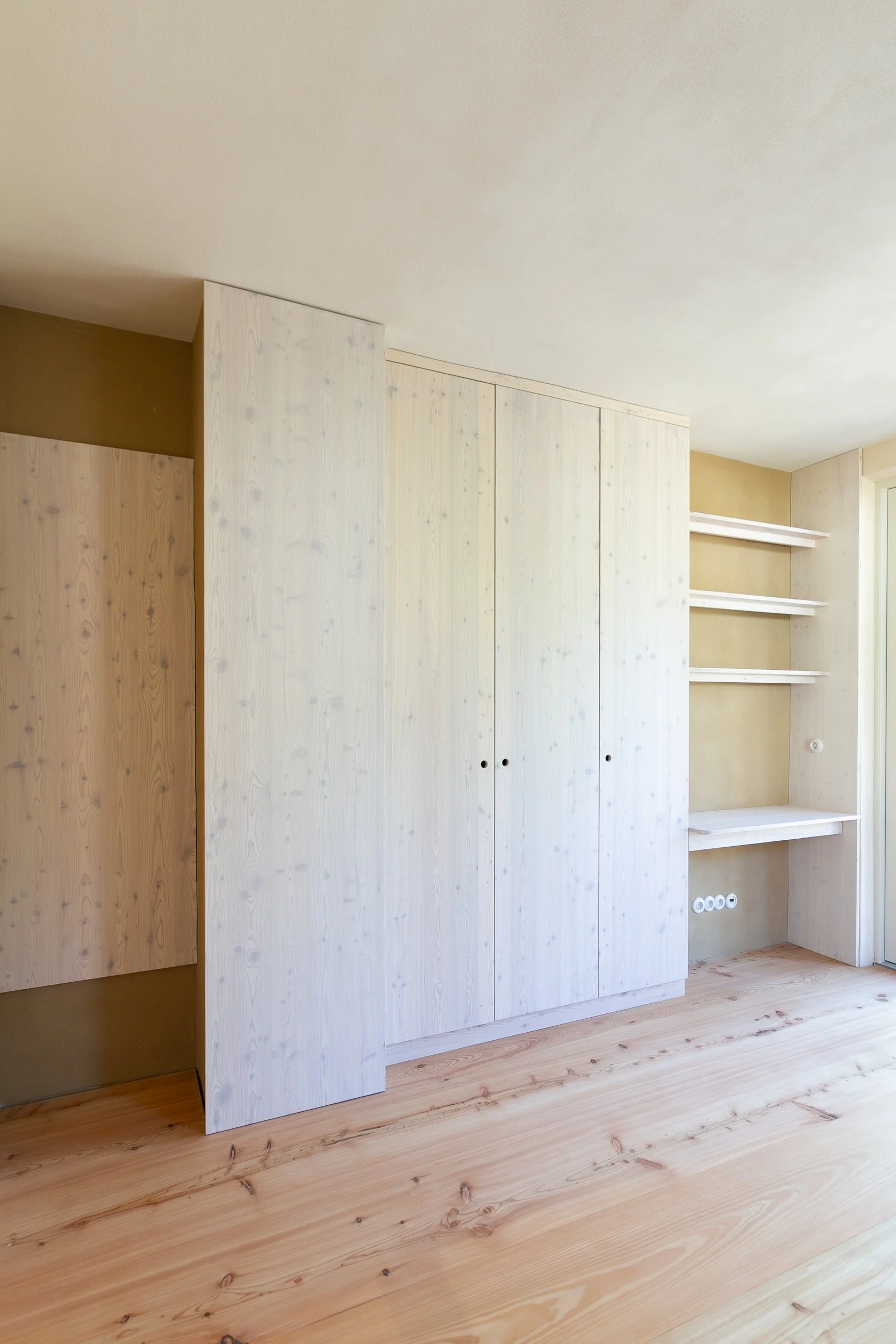 Einbauschrank Schlafzimmer aus Lärche-Dreischichtplatte.
