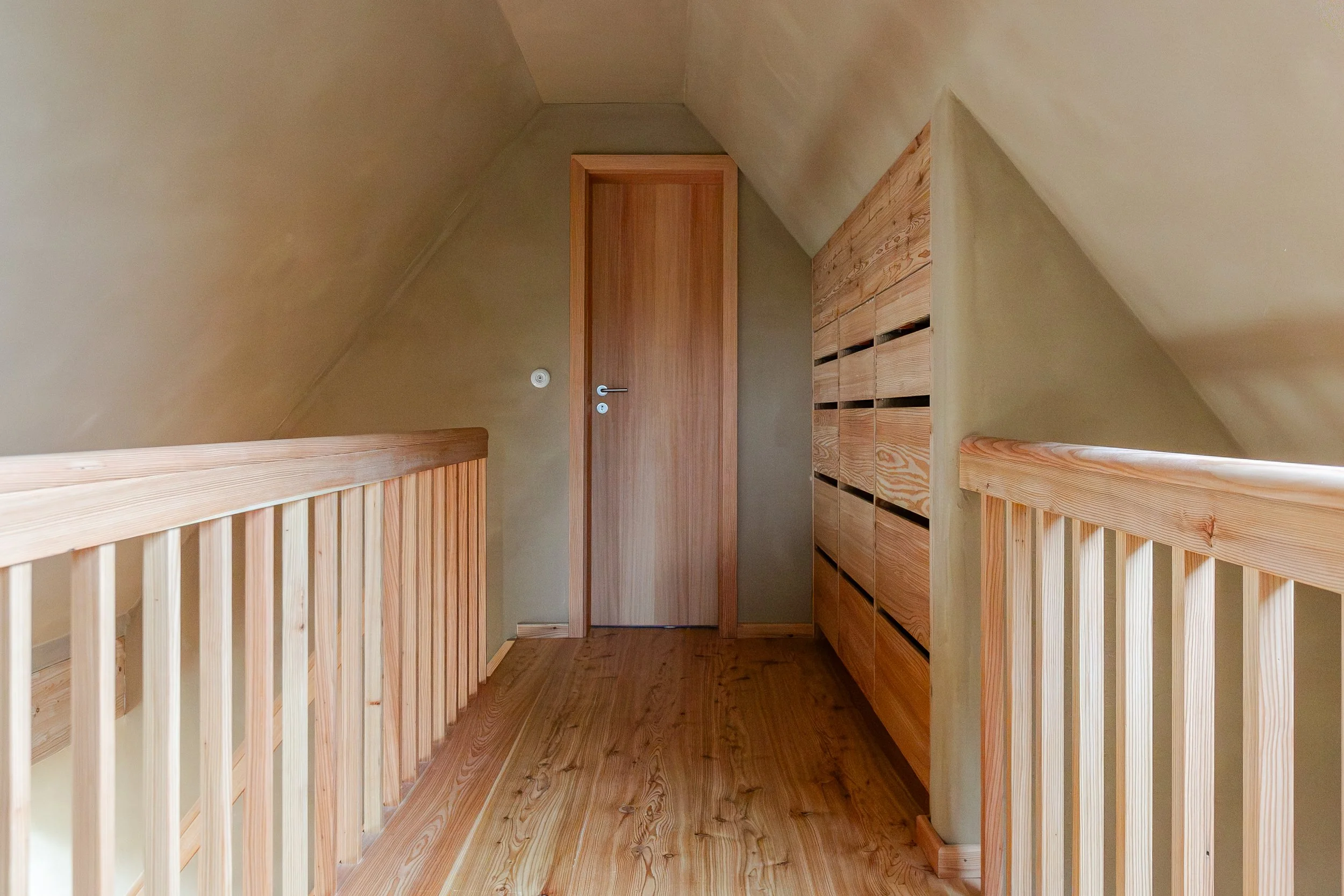 Brüstung aus Lärche-Dreischichtplatte. Treppe aus Massivlärche und Lärchendielenboden.