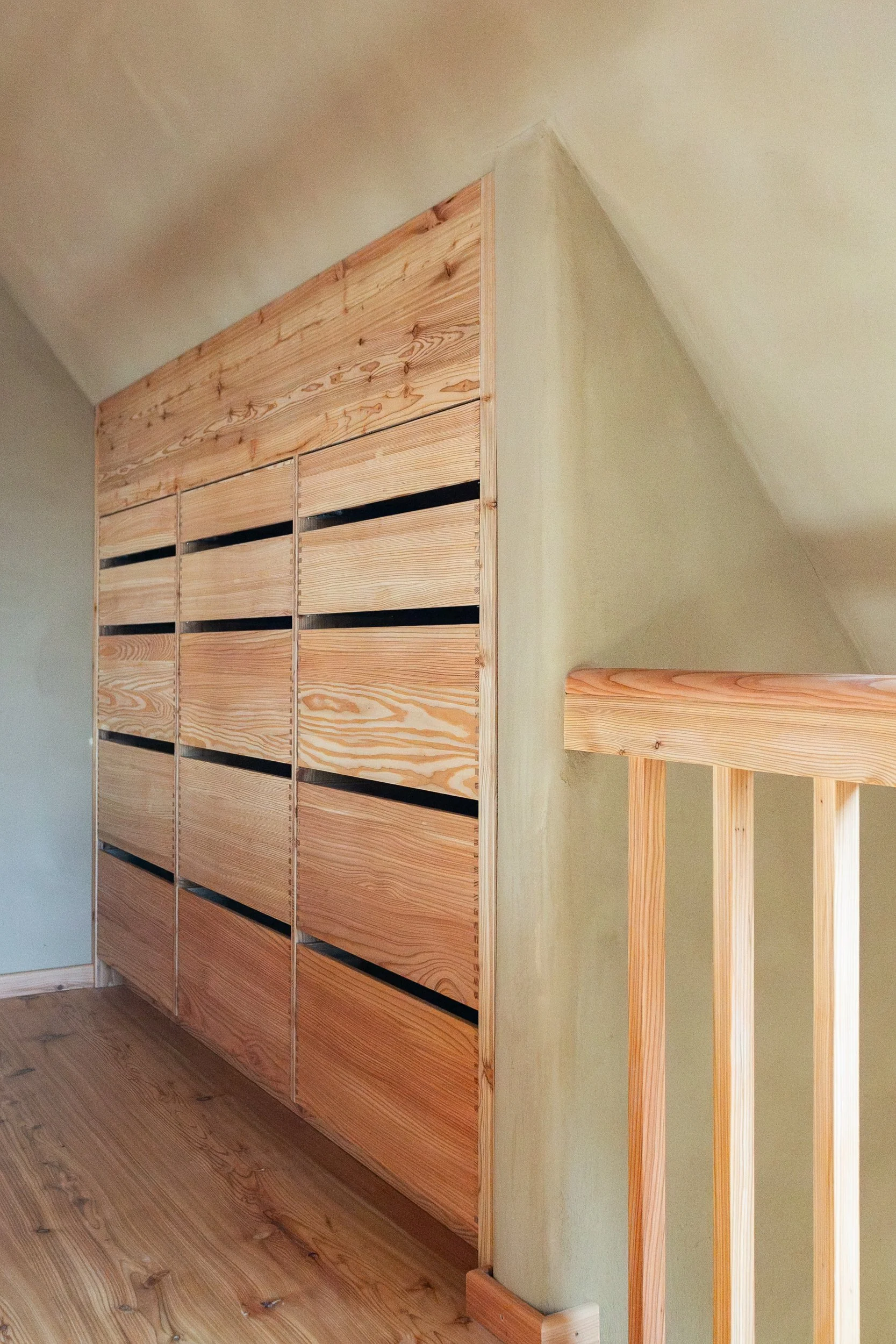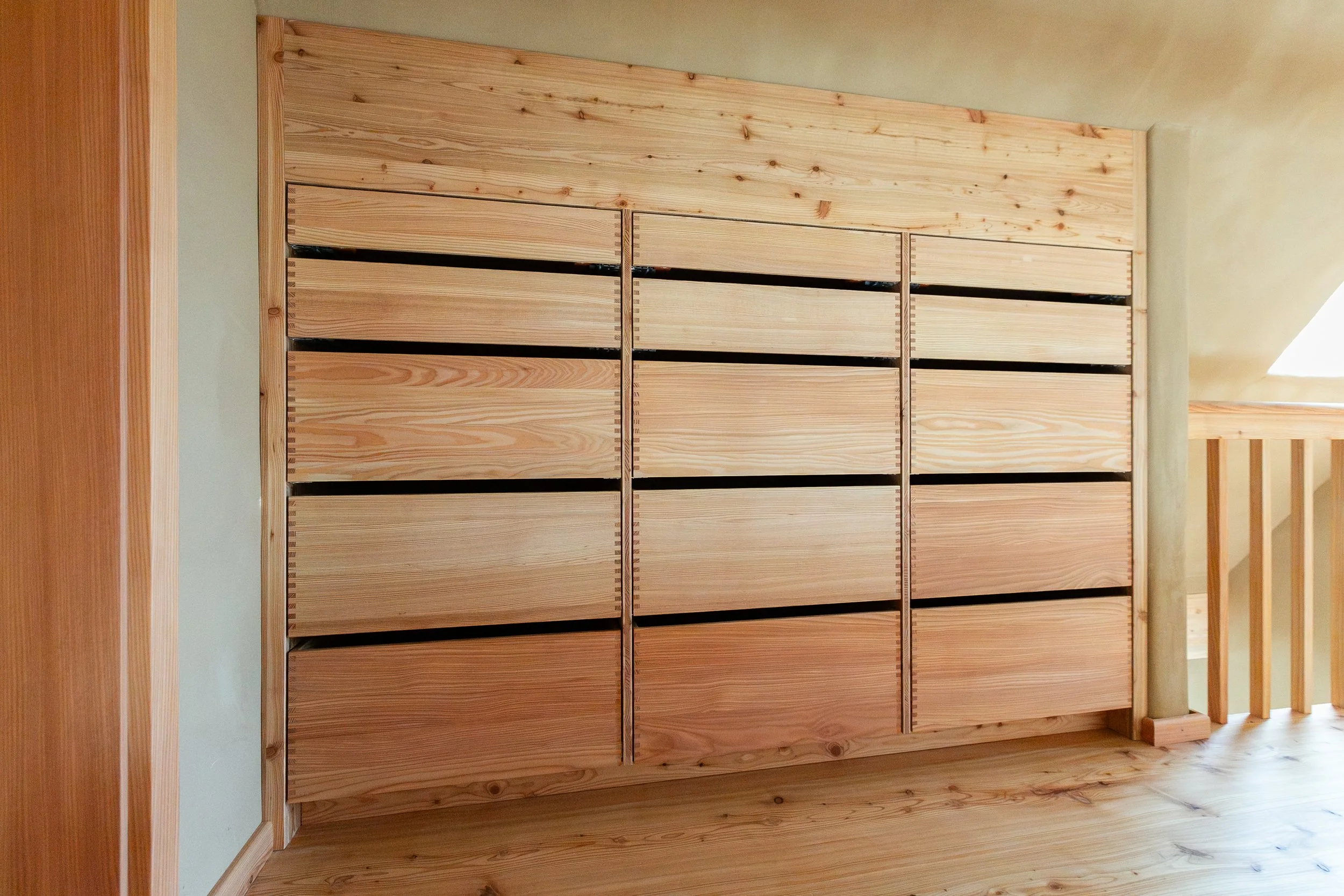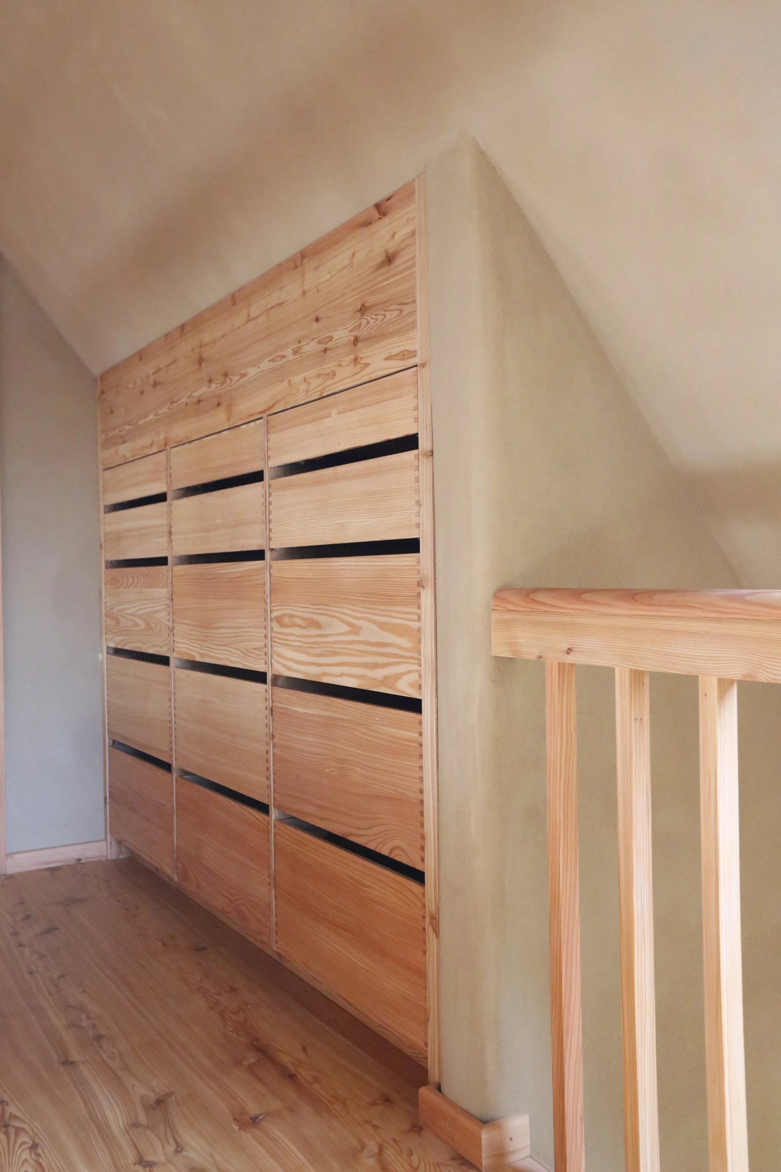 Bei dem letzten Einbauschrank im Dachgeschoss sind wir von der weiß geölten Oberfläche abgewichen. Hier haben wir die Vollholzinnenschubladen aus Lärche direkt verbaut, ohne zusätzliche Fronten.