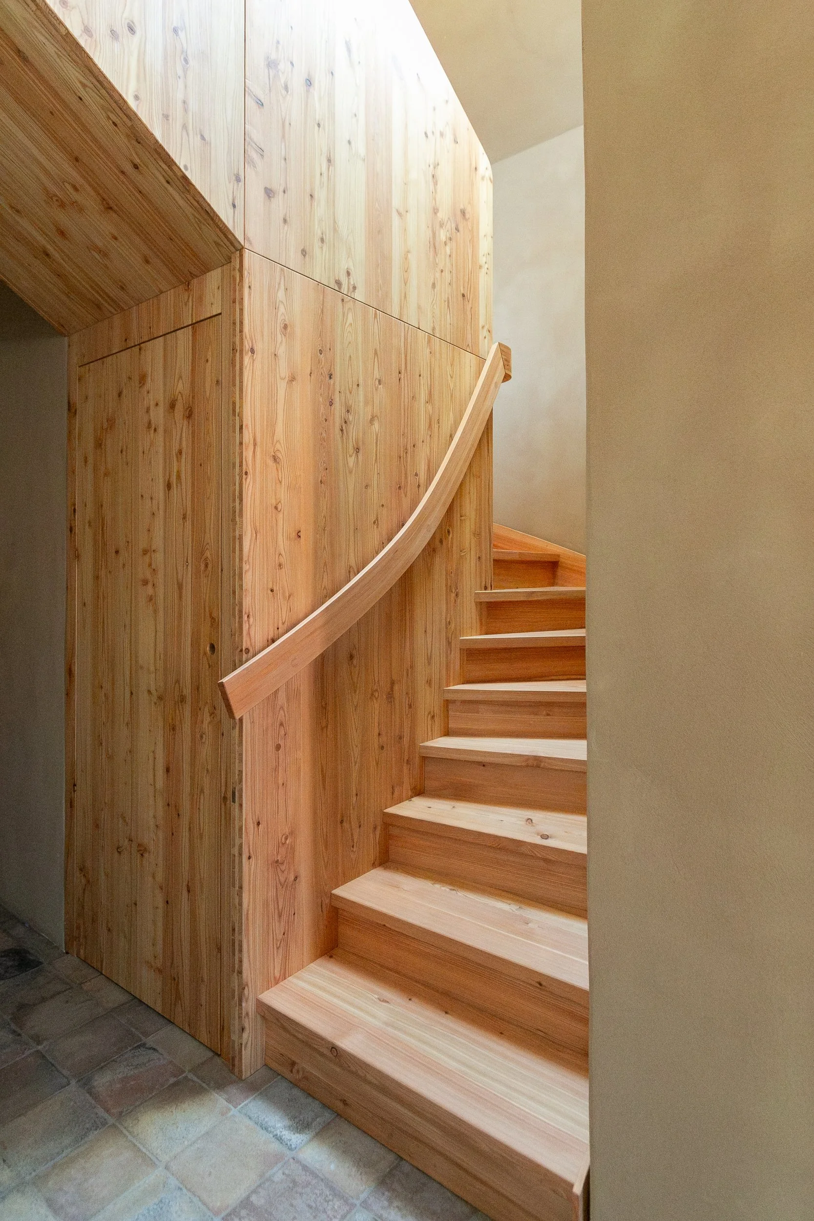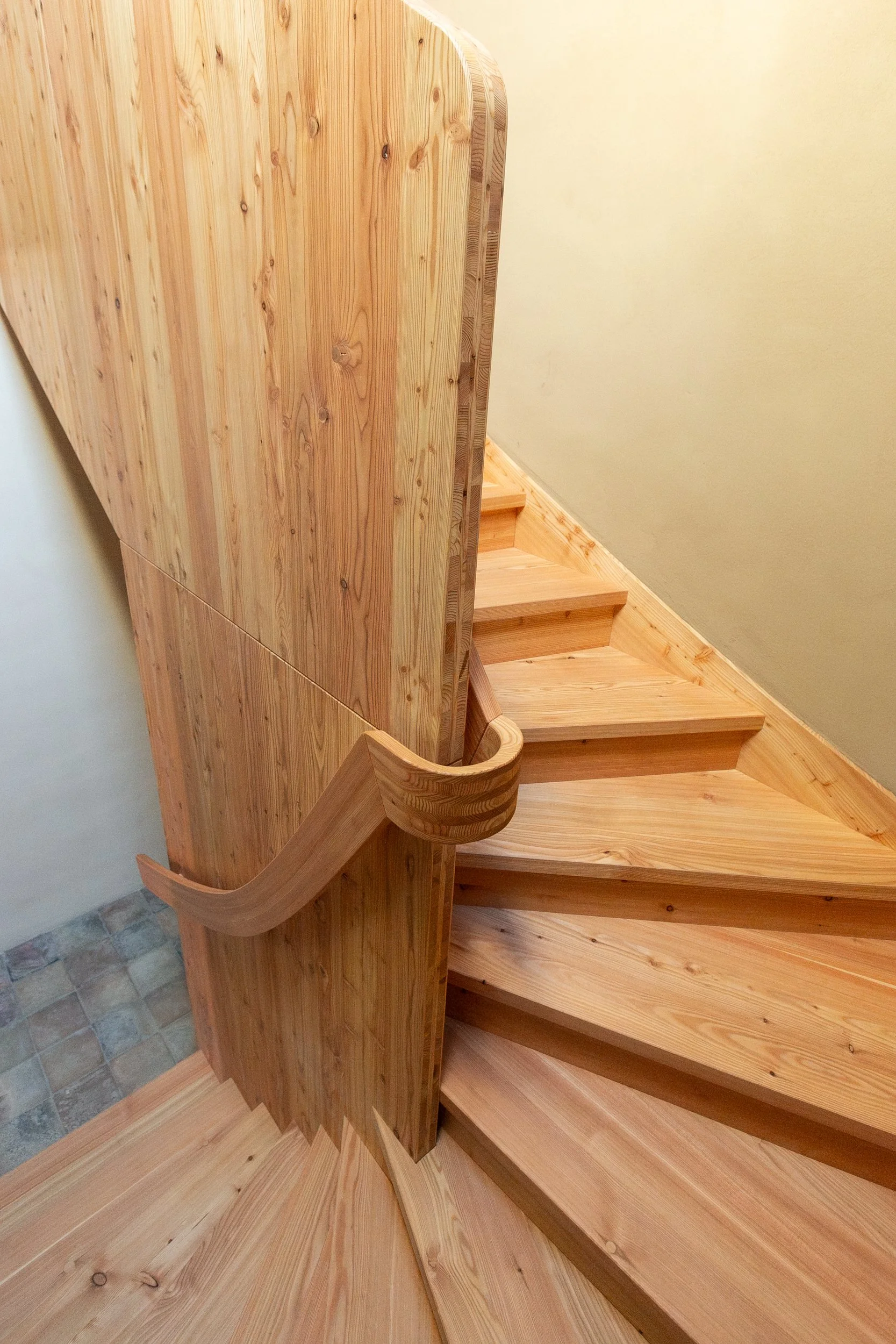 Zur Inspiration diente ein japanischer Wendeltreppenentwurf. Prägnant sind die überstehenden Staketen des Geländers und der Brüstung sowie der Handlauf, der aus drei verleimten Vollholzbauteilen besteht.